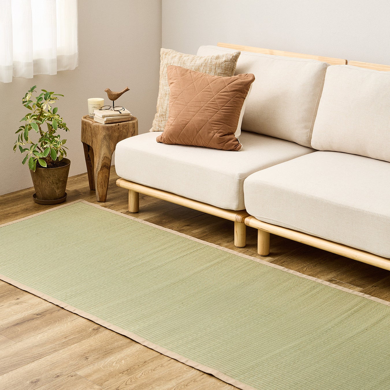 い草が持つ天然の湿度調整機能で、夏場のベタつきがちなフローリングも快適に。蒸し暑い梅雨の時期も暑い夏も素足に心地よい、さらりとした肌触りです。