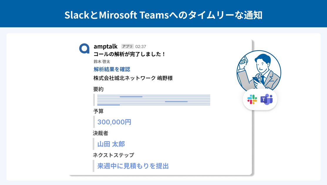 商談後すぐに解析し、SlackやMicrosoft Teamsに通知。商談内容を簡潔に把握可能
