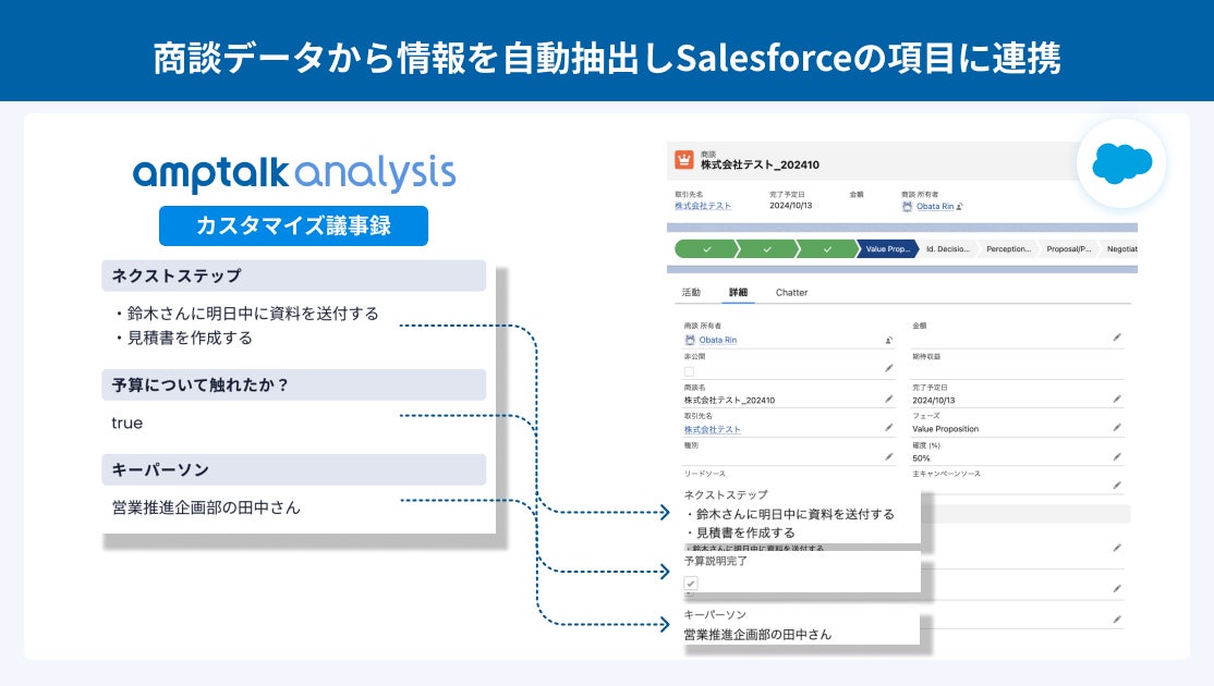 今回のアップデートではamptalk analysisが書き起こした商談内容を、各企業の営業スタイルに合わせた議事録や情報抽出項目を自由に設定可能になります。また、これらによって抽出された情報はSalesforceの入力項目と紐づけることでワンクリックで反映することができます。これにより、マネージャーや営業担当者が確認したい情報や商談の内容を素早く正確に把握することが可能になります。