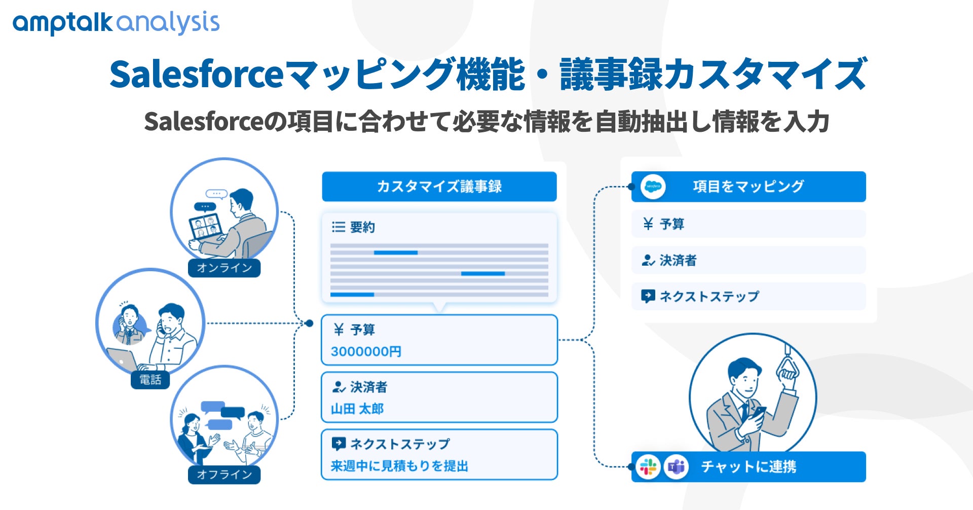 「amptalk analysis」は、IP電話やテレビ会議システムなどあらゆるコミュニケーションツールと連携し、オンライン・オフライン関係なく商談や通話を自動で書き起こし・要約・解析し、Salesforce / HubSpot / Slack / MicrosoftTeamsチャットに自動出力することで、オンライン商談を自動化・可視化します。「amptalk analysis」を用いることで、あらゆる企業のセールスイネーブルメントを実現し、インサイドセールスからフィールドセールス、カスタマーサクセスまで営業組織全体の生産性向上を支援します。