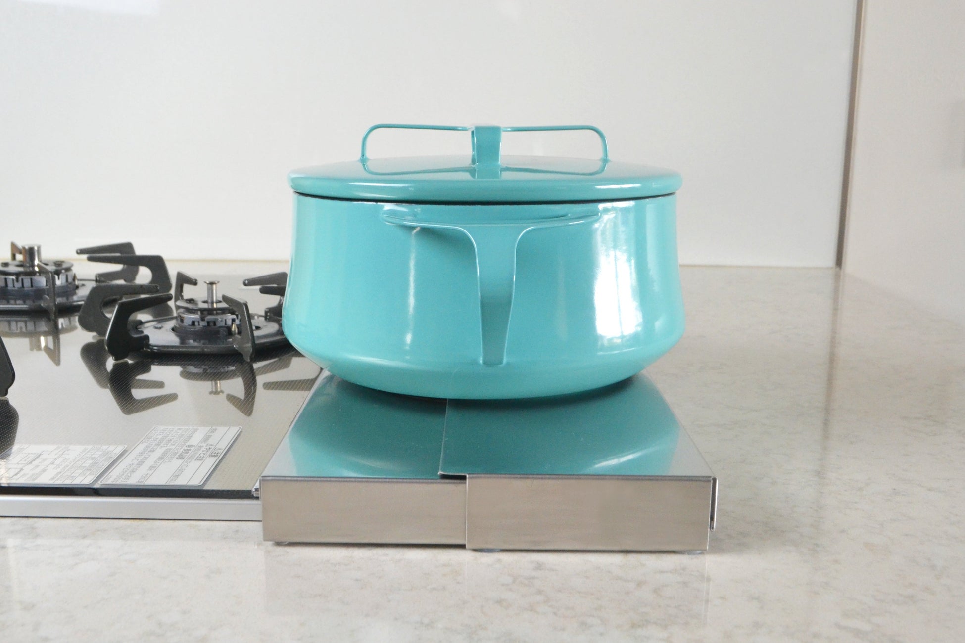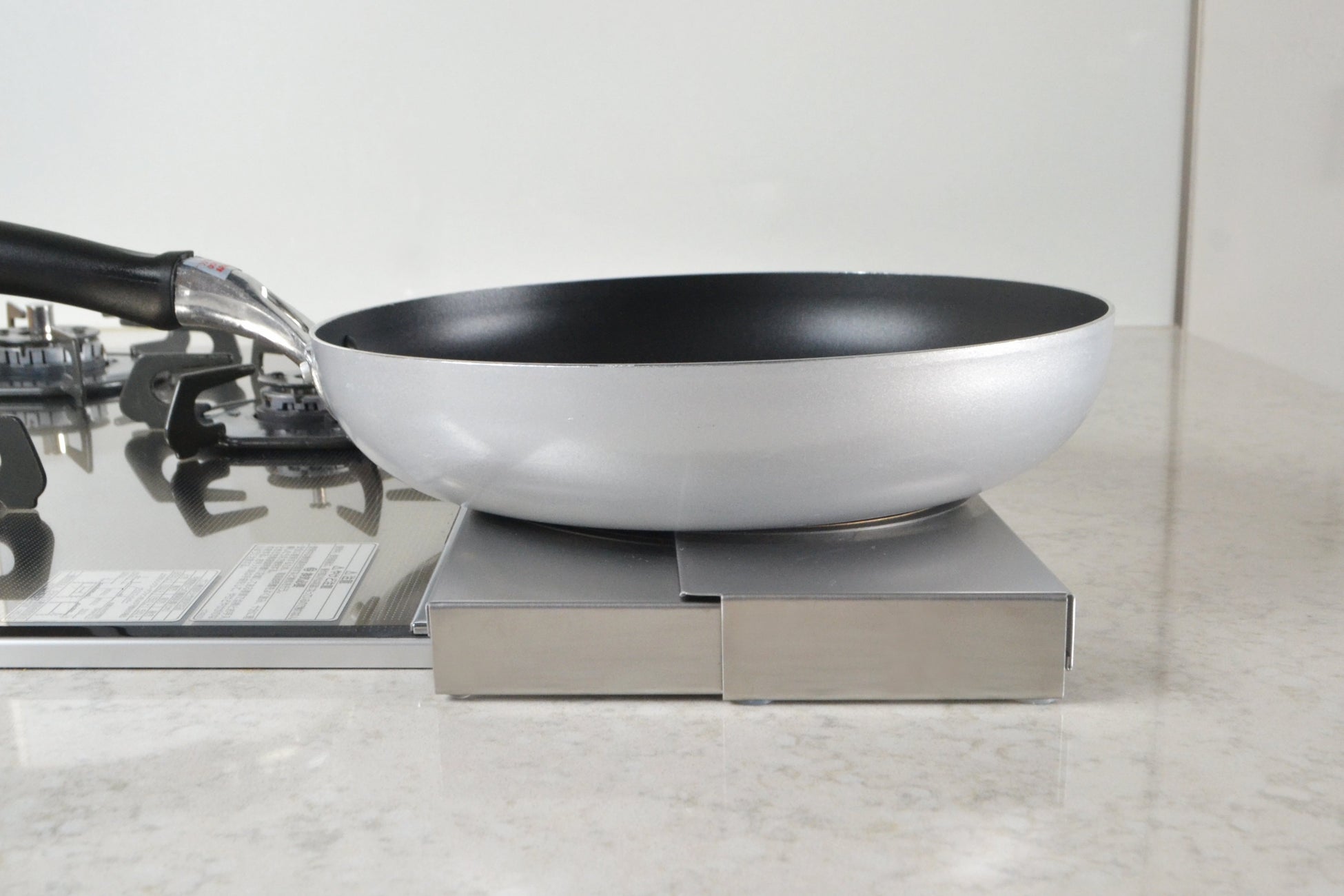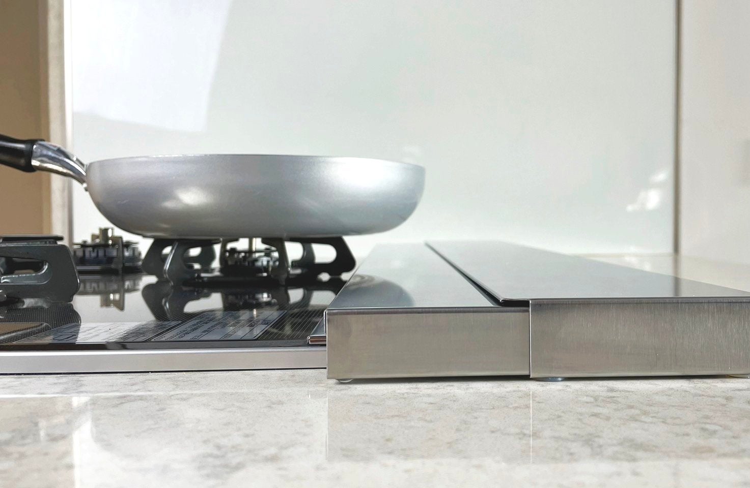伸長時のカバー同士の段差も少なく、物を置いてもガタつきにくいフラットタイプ。底面の広いフライパンなども安定して置くことができます。