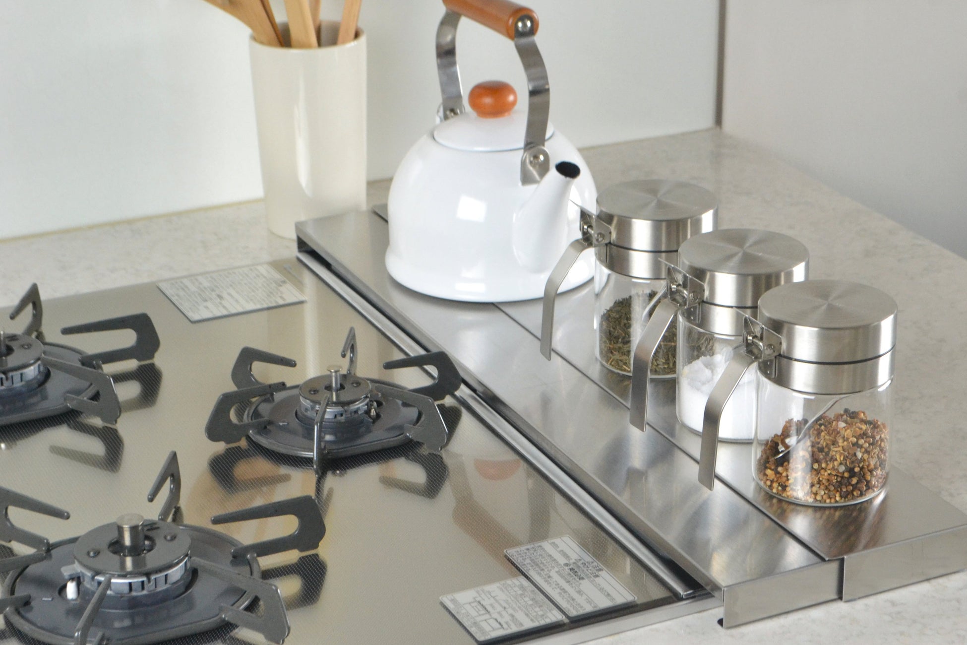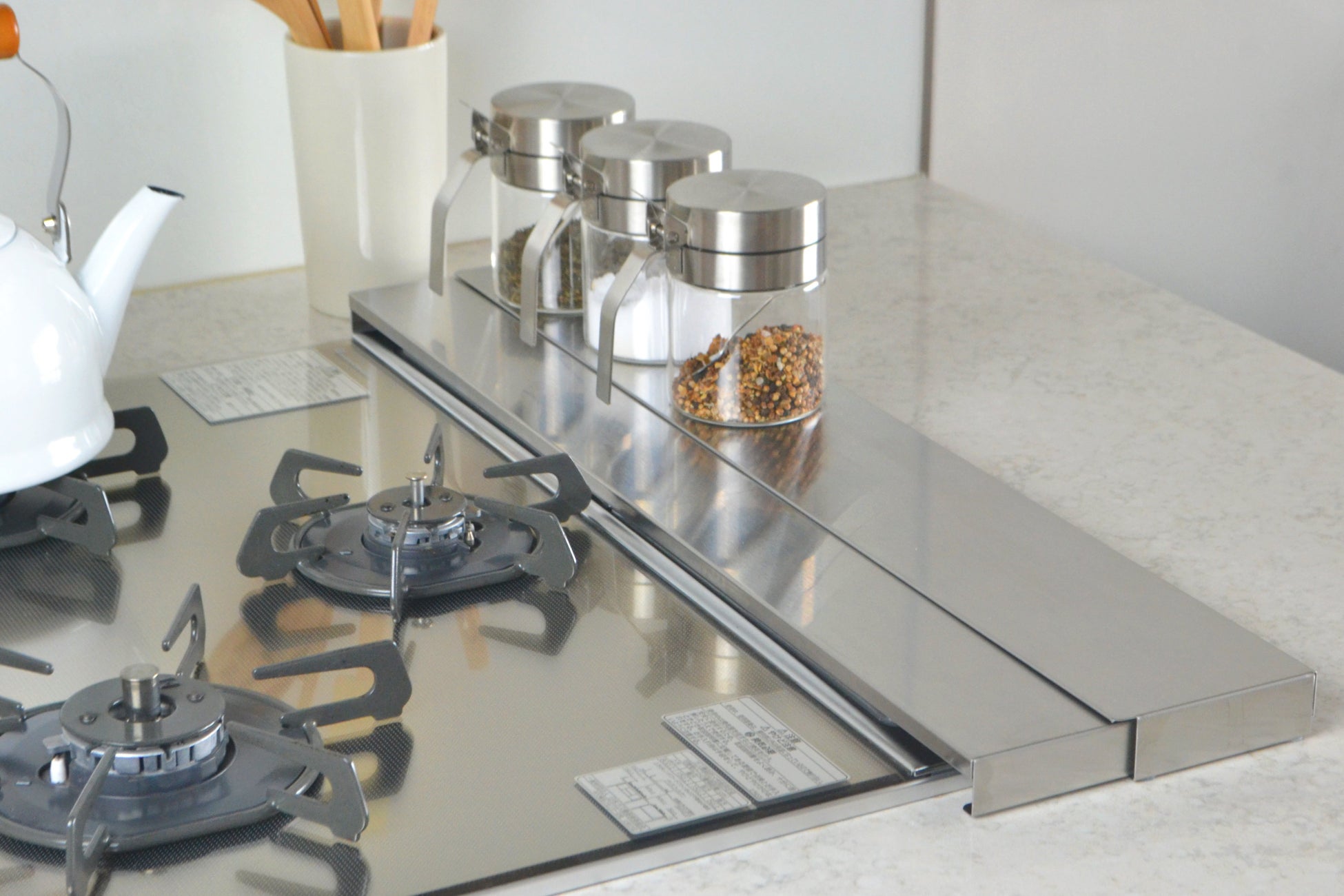 こちらの商品は、ゆったりとした奥行のため、よく使う調味料やケトル置きなどにしてコンロ奥のスペースを活用することができます。伸縮させる際は、手前のカバーをスライドさせるので、奥側に物を置いたまま伸縮可能です。