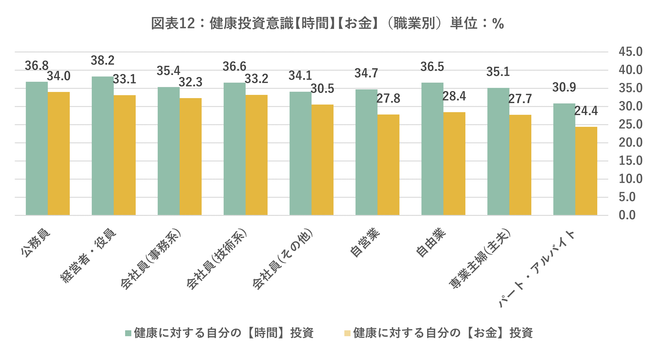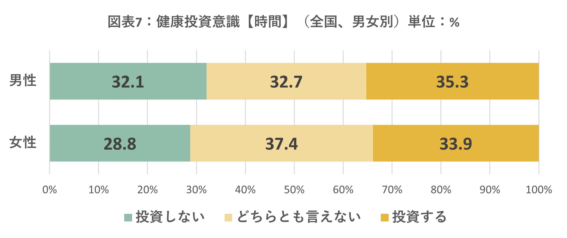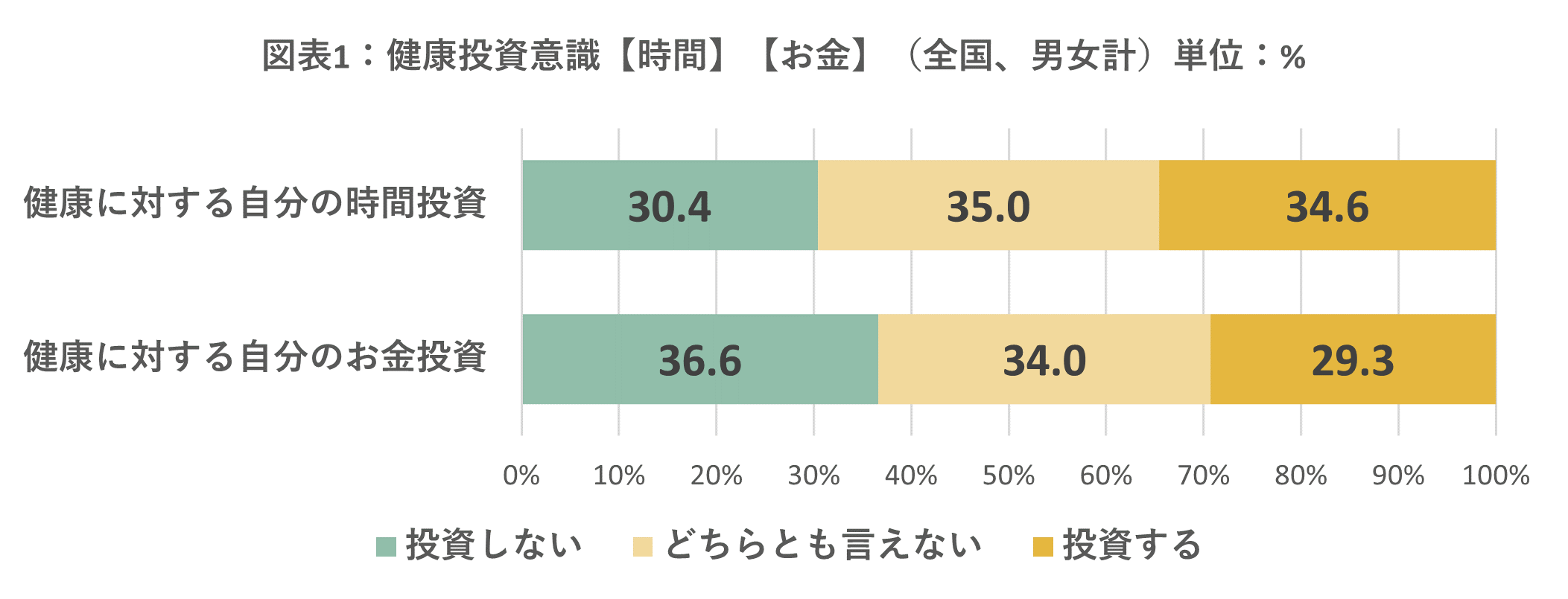 健康に【時間】投資意識のある人は男性で35.3%、女性で33.9%、健康に【お金】投資意識のある人は男性で31.0%、女性で27.7%