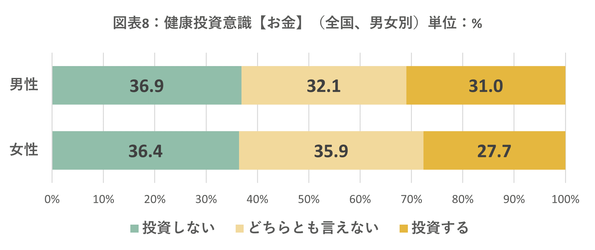 健康投資意識【お金】について男女別で比較すると、男性は投資する31.0%、どちらとも言えない32.1%、投資しない36.9%となっています。女性は投資する27.7%、どちらとも言えない35.9%、投資しない36.4%となっており、男性の方が女性に比べて1.12倍【お金】への健康投資意識が高い結果となりました。