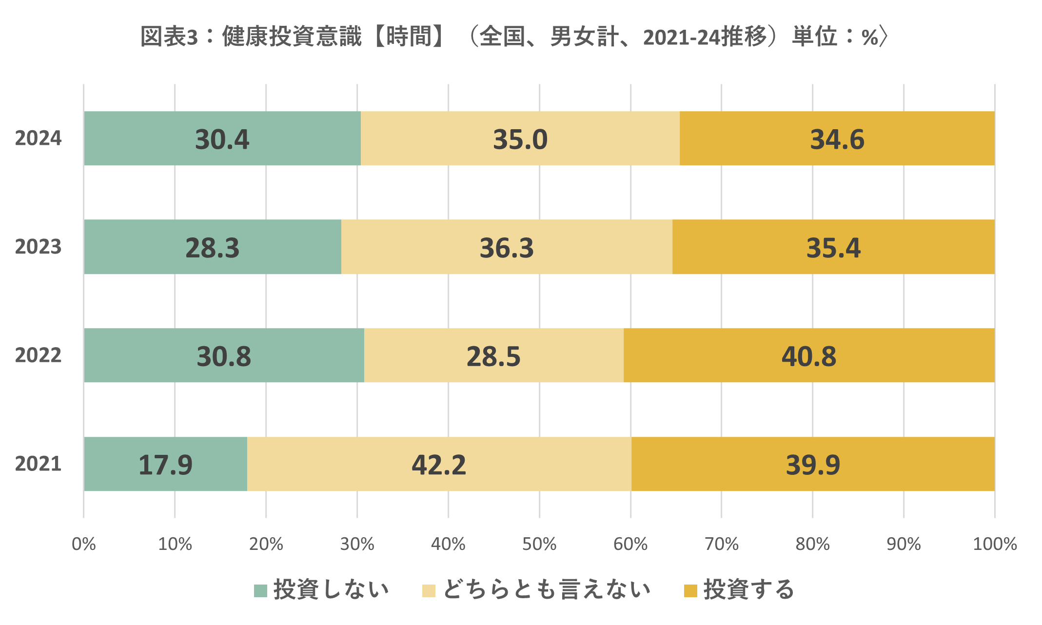 健康投資意識について過去4年の比較をすると、健康に【時間】を投資する人は2021年39.9%、2022年40.8%、2023年35.4%、2024年34.6%と推移しており、この4年で減少傾向にあり、投資しない人は2021年17.9%、2022年30.8%、2023年28.3%、2024年30.4%と推移しており、2021年からの比較では12.5%増加しています。