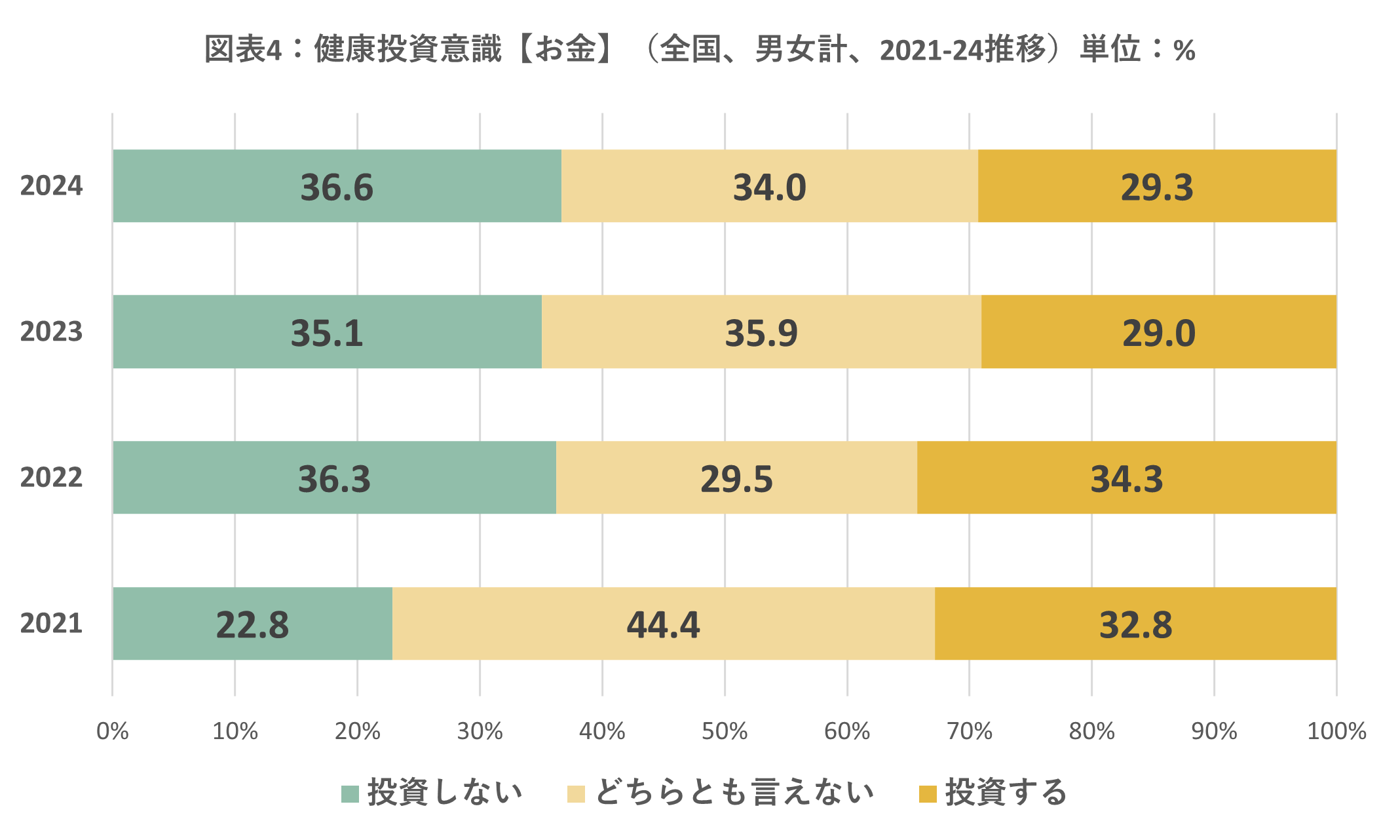 健康に【お金】を投資する人は2021年32.8%、2022年34.3%、2023年29.0%、2024年29.3%と推移しており、こちらも同様にこの4年で減少傾向、投資しない人は2021年22.8%、2022年36.3%、2023年35.1%、2024年36.6%と推移しており、2021年からの比較では13.8%増加となっています。健康に対する時間の投資は減少傾向、お金への投資は横ばいという結果となりました。