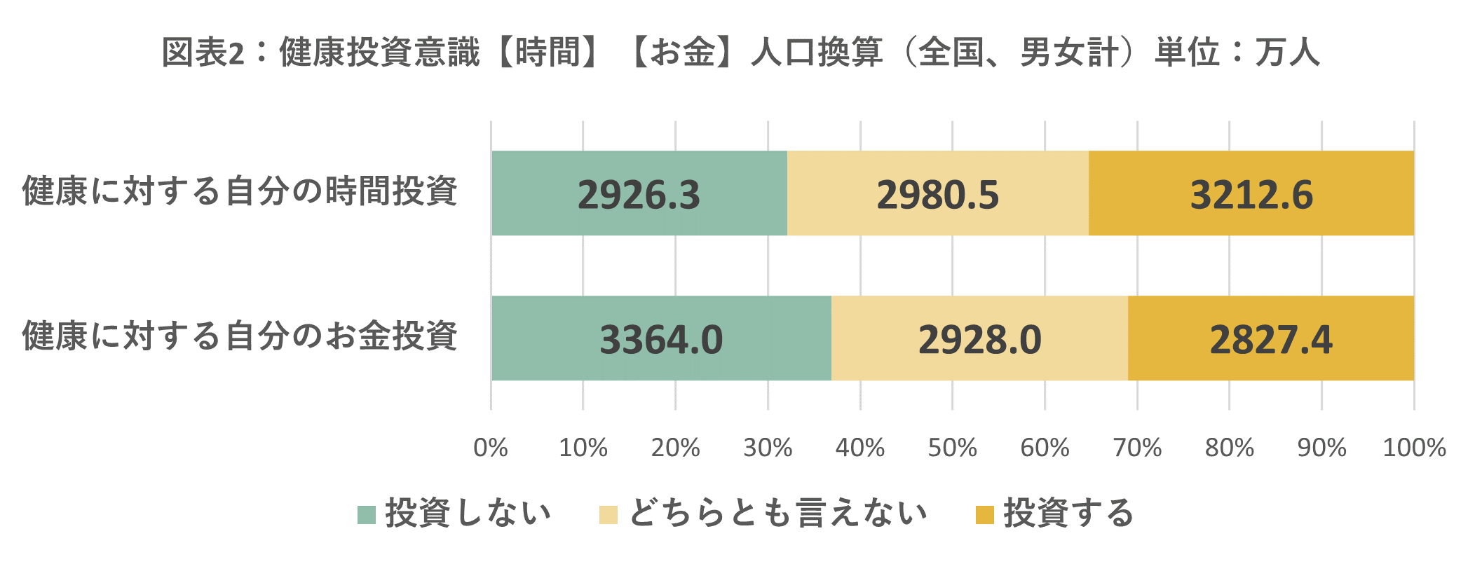 健康に【時間】投資意識のある人は3212.6万人、意識のない人は2926.3万人、健康に【お金】投資意識のある人は2827.4万人、投資しない3364.0万人
