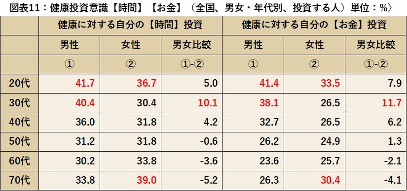 男女で比較すると、男女格差が最も広がるのは30代で、時間への投資は男性の方が10.1%多く、お金への投資は男性の方が11.7%多いという結果となりました。
