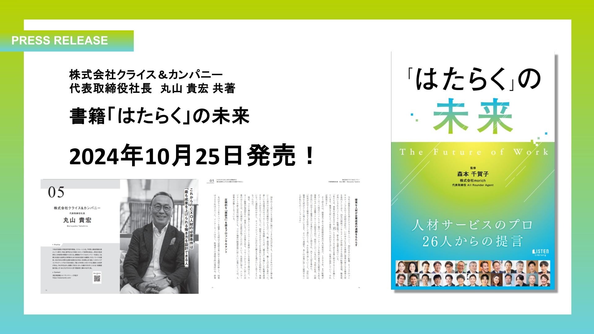 ハイクラス転職支援の株式会社クライス&カンパニー(本社所在地:東京都港区、代表取締役社長:丸山 貴宏)は、株式会社morich森本 千賀子氏監修・リスナーズ株式会社のプロデュースによる書籍『「はたらく」の未来』に共著者として参画し、同著が2024年10月25日にAmazon.co.jpより発売されることをお知らせいたします。