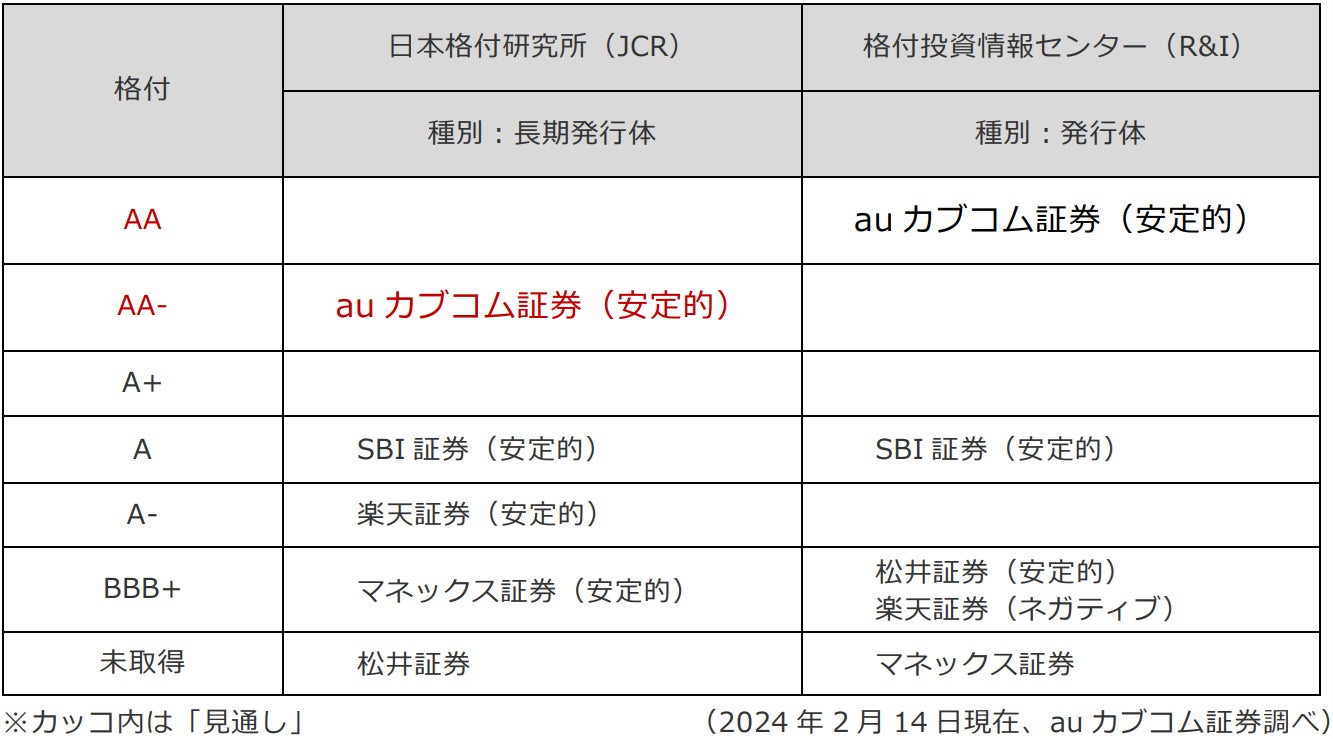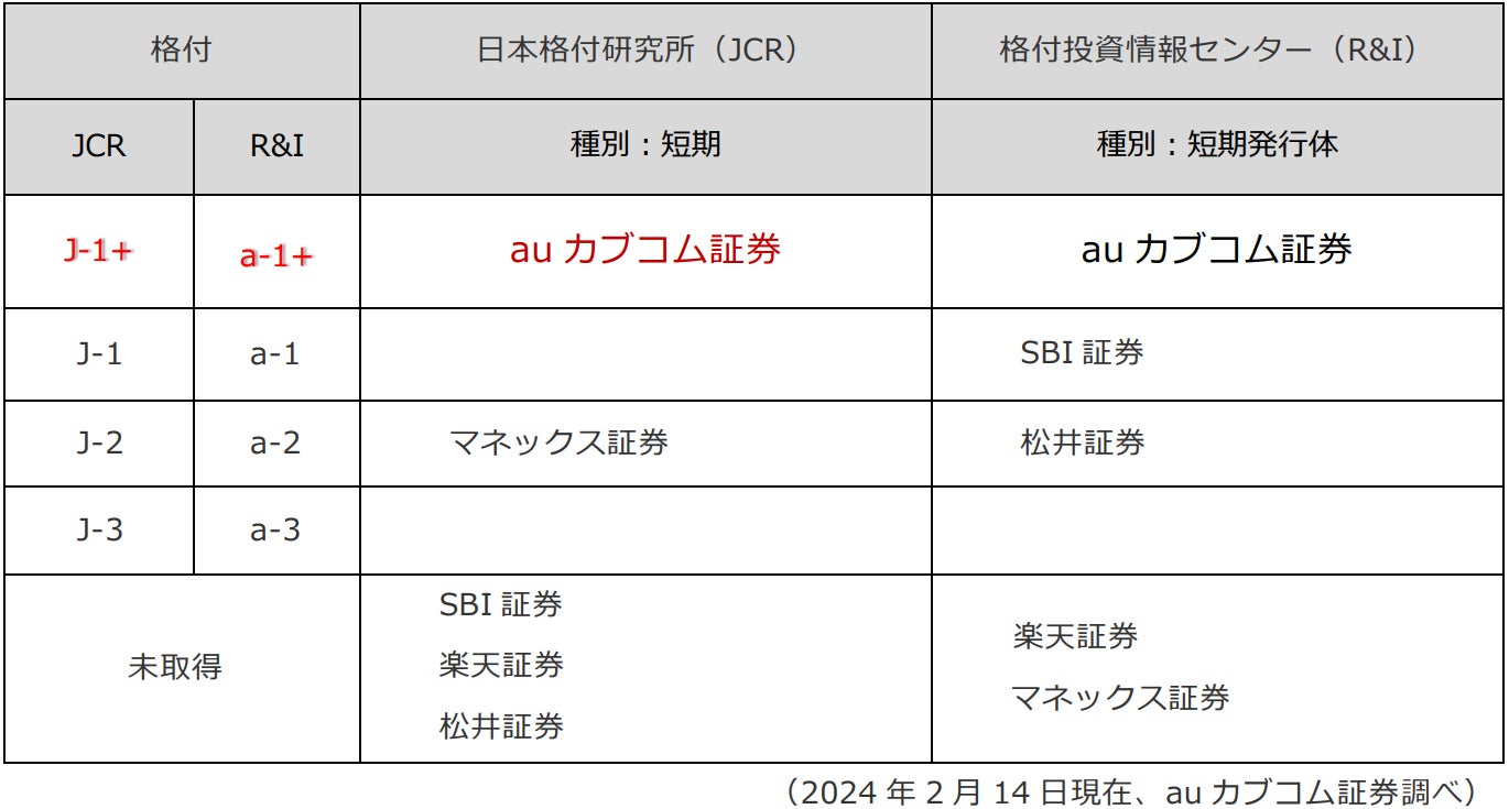 auカブコム証券株式会社(本社:東京都千代田区、代表取締役会長兼社長:二宮明雄、以下「auカブコム証券」)は、2024年2月14日、日本格付研究所(以下「JCR」)による発行体及び短期格付が、下表のとおりとなったことをお知らせいたします。
