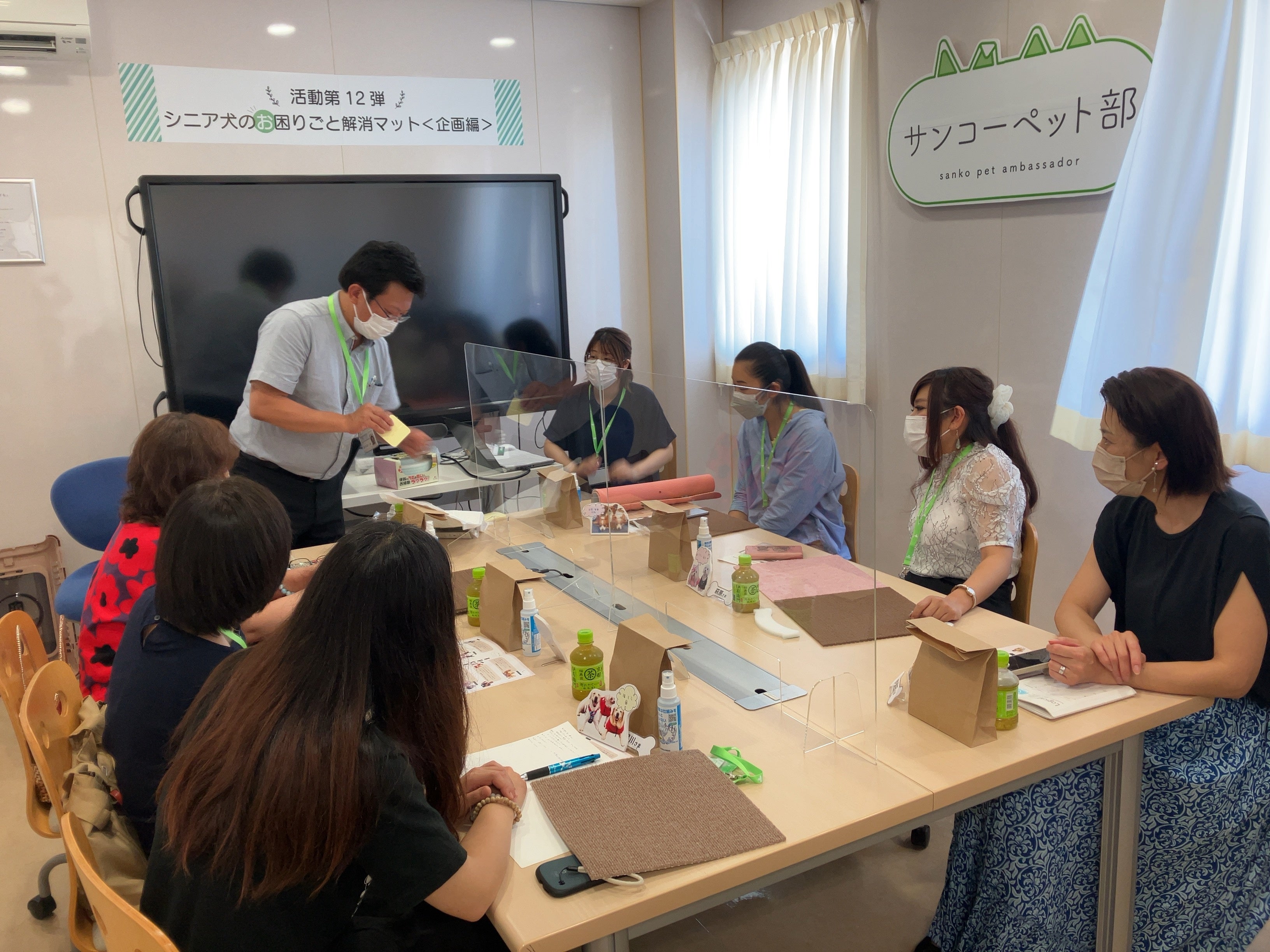 座談会では6名の部員さんに参加いただき、事前に皆様に回答いただいたアンケートをもとに、シニア犬や介護について意見交換を行い、「大型犬は体重があるので介護が大変」「目が見えにくくなるとトイレトレーの段差が危ない」など、マット以外にも様々なお悩みがあることが分かりました。また、東京都の赤坂で犬専門の骨格矯正を行っている株式会社Essenceの福井先生をお招きし、ペットの怪我や食事についてお話をしていただきました。