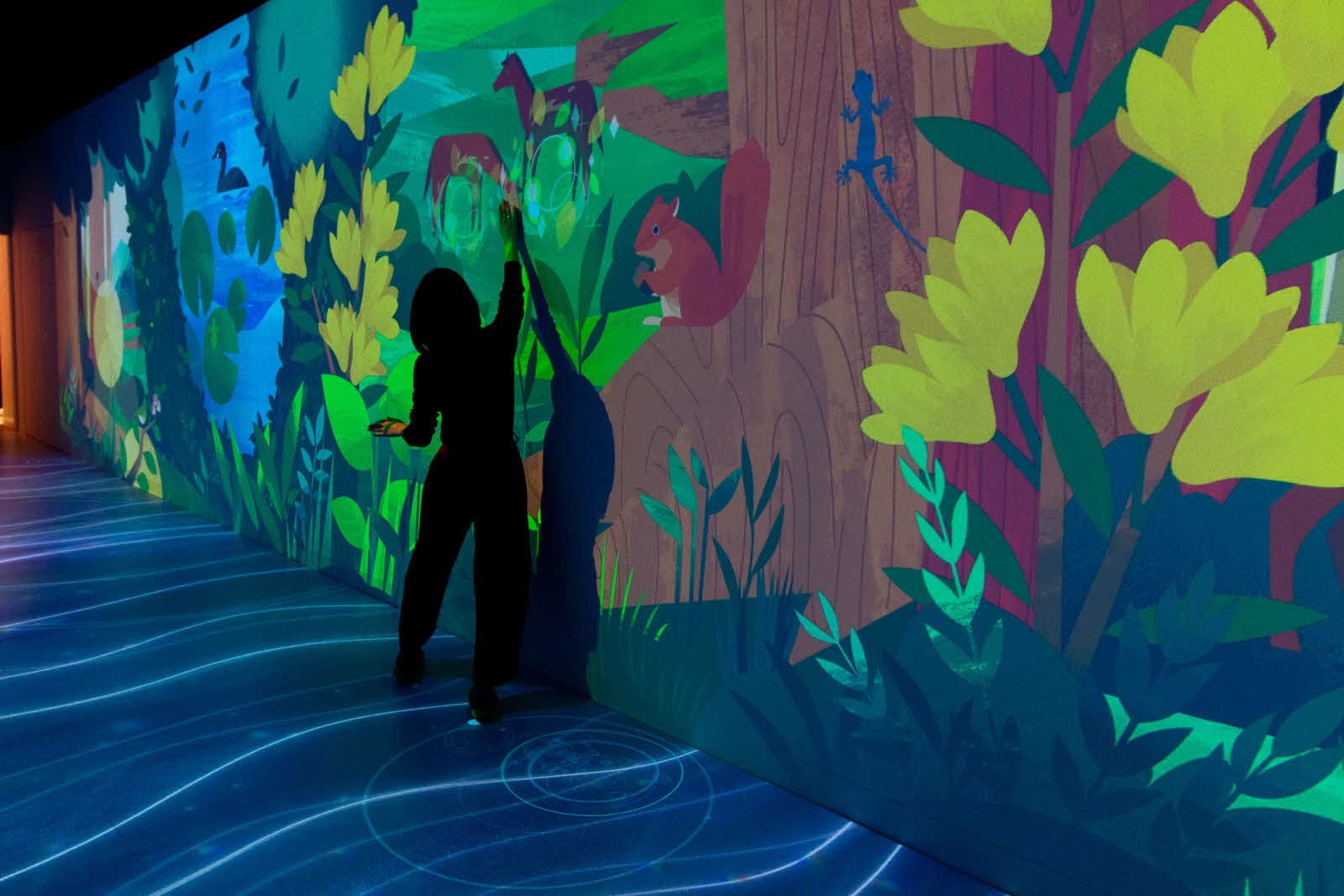 床・壁一面のダイナミックな映像と身体の動きが反応し、自分と環境との関わりを空間全体で疑似体験することができます。これは、同施設でしか体験できないオリジナルコンテンツです。