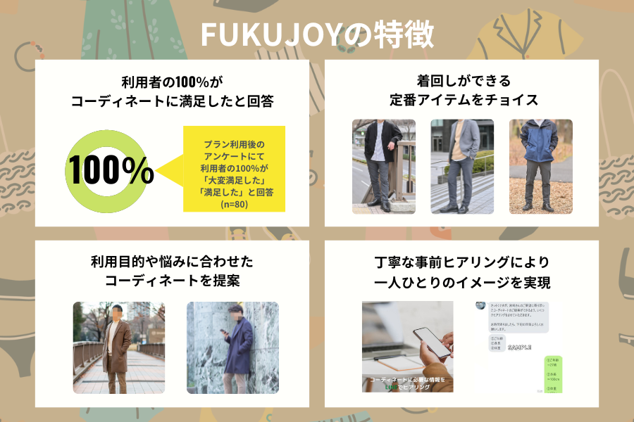 「FUKUJOY」が過去利用者80名を対象に利用後アンケートを実施したところ、「担当スタイリストには満足できたでしょうか」という質問に「大変満足した」「満足した」と回答した人は98.75%でした。また、「当日のコーディネートには満足できたでしょうか」という質問に「大変満足した」「満足した」と回答した人は100%でした。このように、コーディネートやスタイリストに対し高評価をいただいております。(2023年5月末時点)