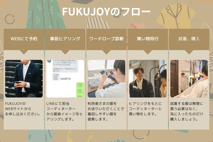 「FUKUJOY」では、トレンドや色合わせ、サイズについての知識を持ったスタイリストが、利用者様一人ひとりの予算や好み、体格などに合わせながら、清潔感のあるコーディネートをご提案します。事前にSNS等を通して直接利用者様にヒアリングを行い、当日のコーディネートの仕上がりイメージを共有し、買い物同行ではスタイリストが下見・選定したお店(ファストファッションブランドやセレクトショップ)を2時間一緒に回ります。前もって買い足すものを決めておくことで、スタイリストのアドバイスを受けながら欲しいアイテムを購入することができます。