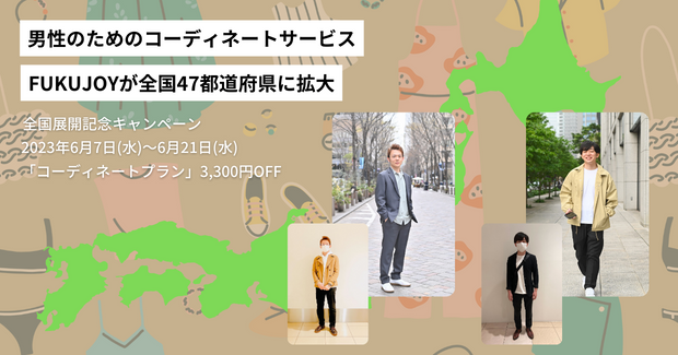 男性のためのファッションコーディネートサービス「FUKUJOY」が全国47都道府県に拡大!6月7日(水)より「全国展開記念キャンペーン」として、「コーディネートプラン」を3,300円OFFで提供