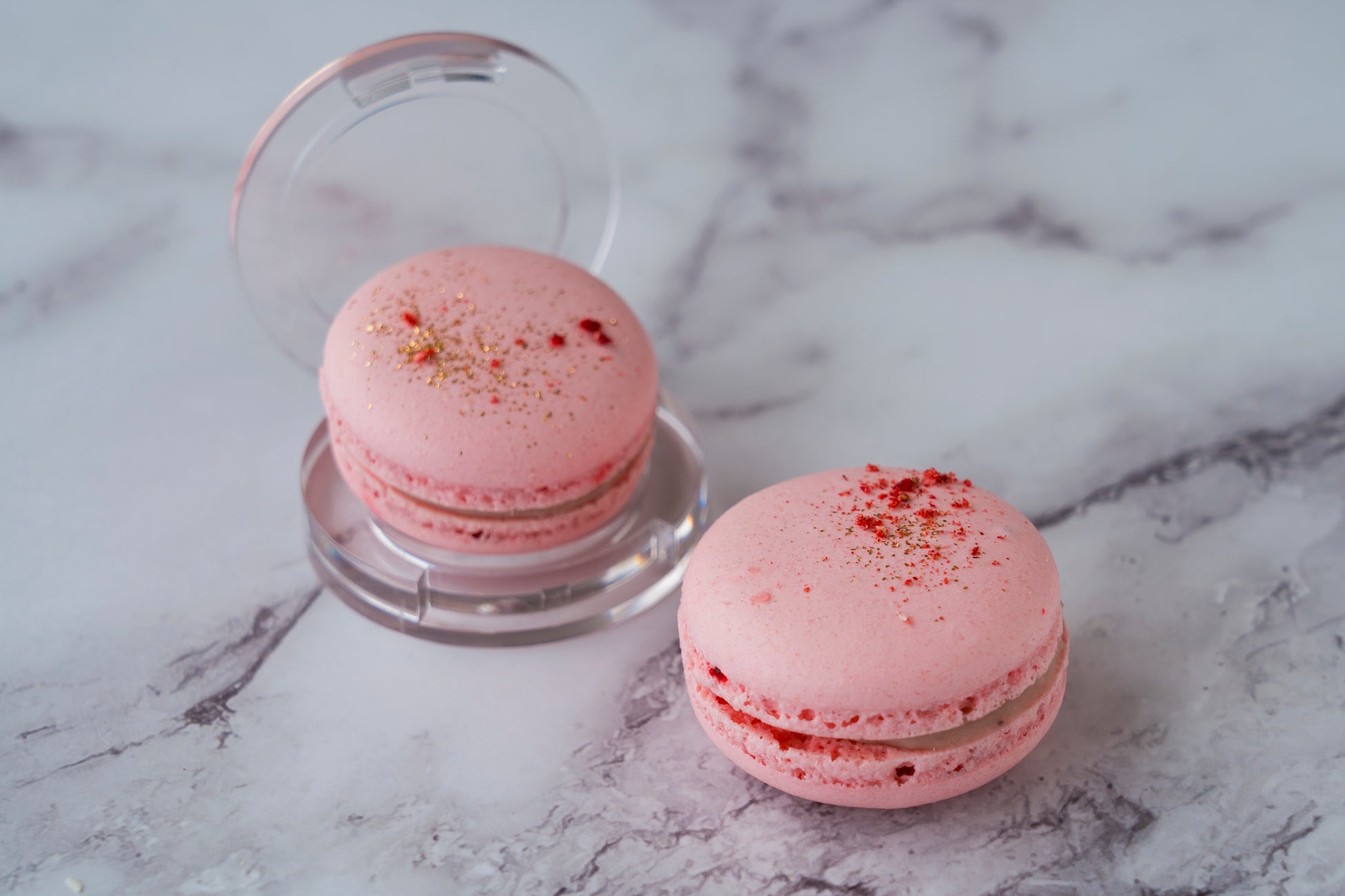チークのような淡いピンク色が可愛らしい「ストロベリーチークマカロン」 は、ストロベリーとココナッツのクリームを挟み、ストロベリーパウダーと金粉をトッピングしました。まるで本物のリップスティックのような見た目の「ストロベリーリップチョコ」は、容器をくるくると回して、ストロベリー風味のチョコレートをお楽しみください。白いコスメポーチに見立てた「ストロベリーコスメポーチ」は、フレッシュ苺とピスタチオのディプロマットクリームを乗せたタルトを、繊細なチョコレート細工で包んだ一品。透き通った赤色のゼリーが印象的な「ストロベリーダイアモンド」は、ミント風味の苺とブルーベリーのマリネを忍ばせたタルトの上に、ストロベリーとエルダーフラワーのゼリーをダイアモンドに見立てて乗せ、まるでアクセサリーのような装いに仕上げました。
