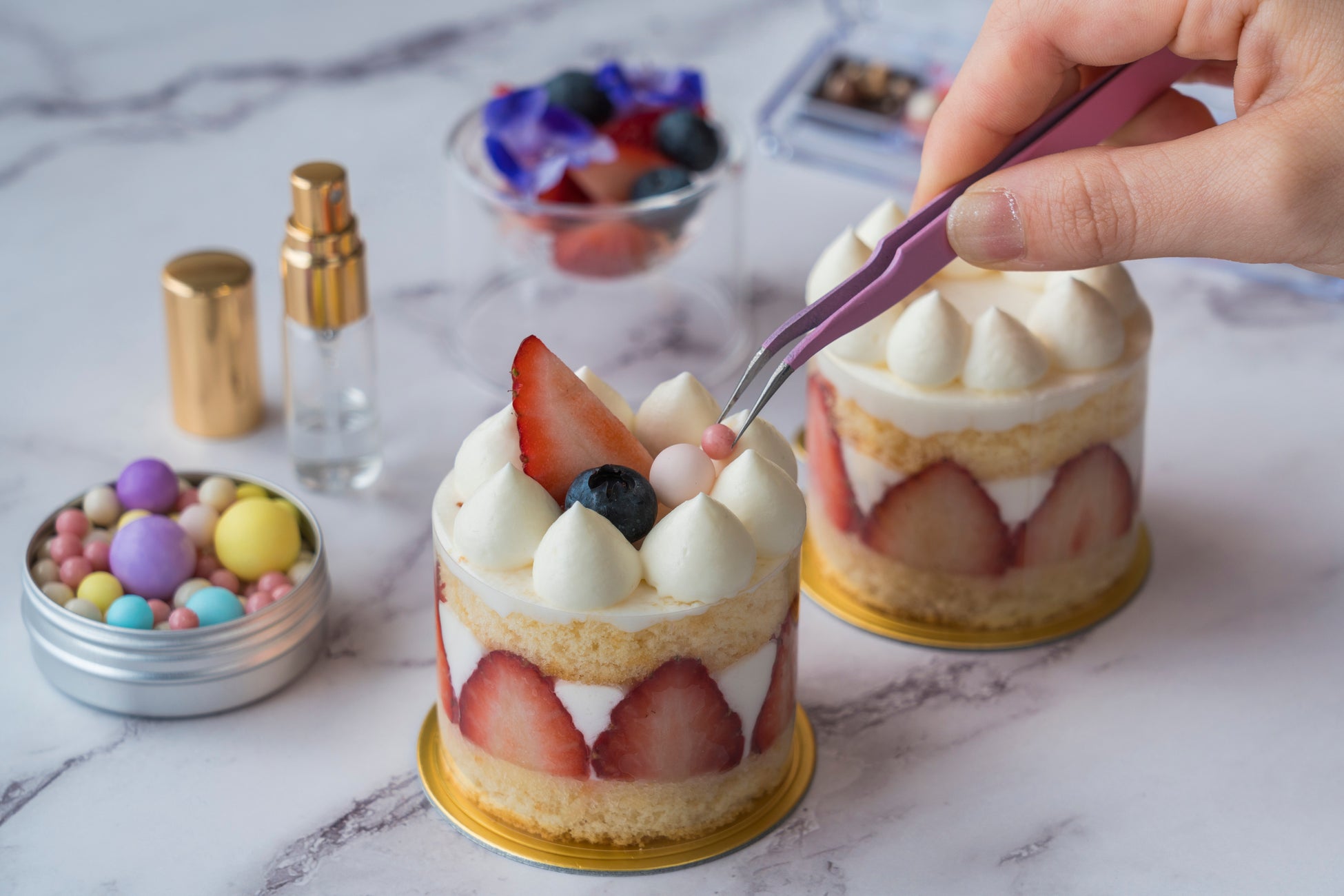 また、ご自身でデコレーションが出来る「メイクアップ・ショートケーキ」は、筒形のシンプルなストロベリーショートケーキにフレッシュベリーやパールチョコレート、エディブルフラワーをお好みで乗せてカスタマイズできるスイーツです。仕上げにミニボトルに入ったローズウォーターを吹きかけて香りを纏わせる、世界で一つだけのオリジナルケーキ作りをお楽しみください。