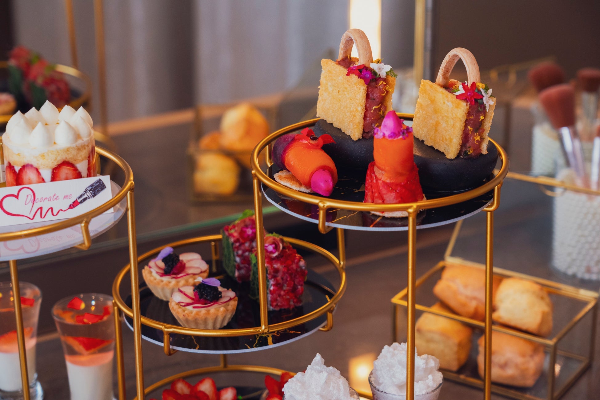 たっぷりの苺を用いたコスメやファッション着想のスイーツ&セイヴォリー。パールやチョコレートでデコる新感覚スイーツも登場!