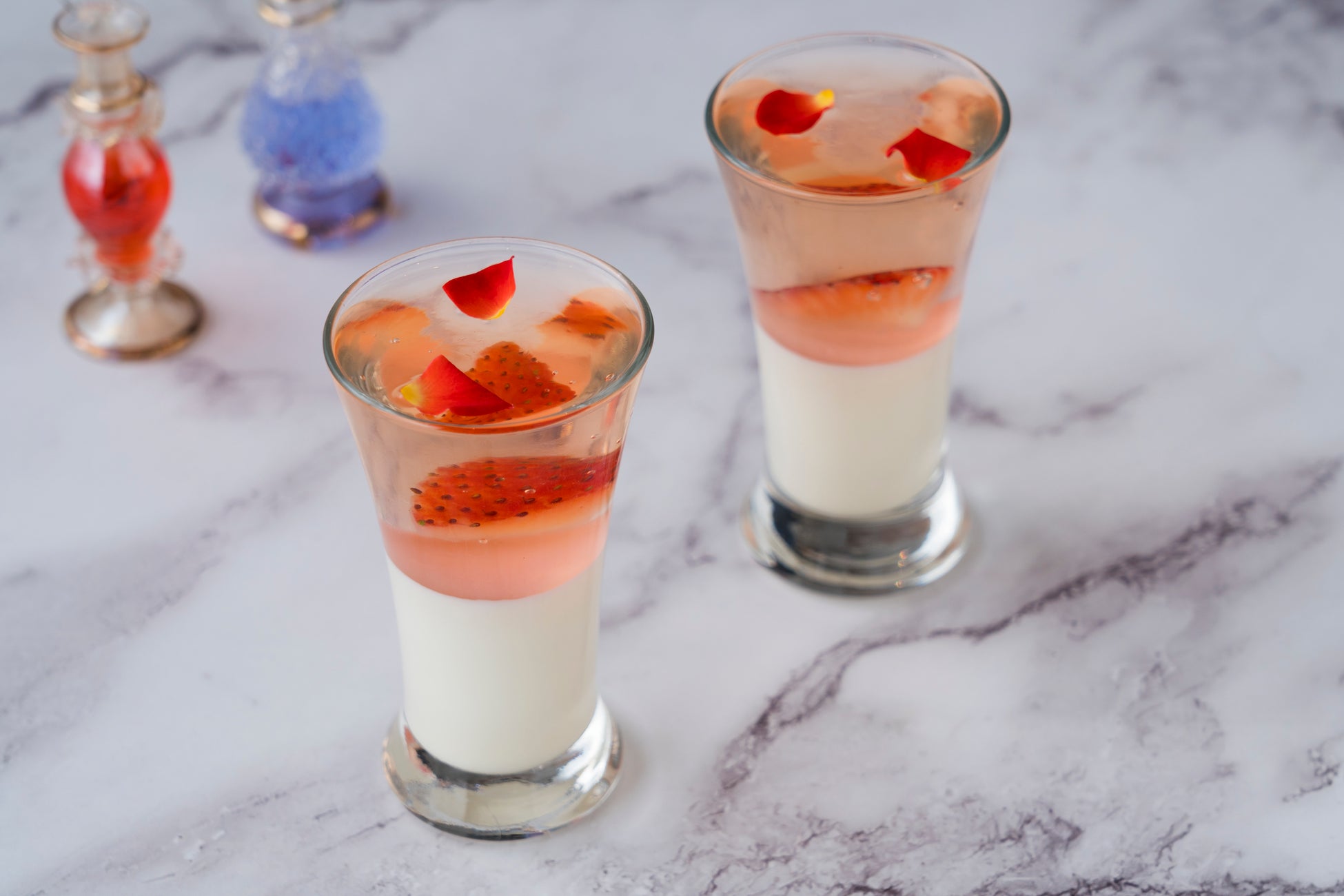 その他にも、メイクパフをイメージした軽いくちどけのチョコレートスフレケーキの上に、生クリーム、苺ソース、フレッシュ苺をトッピングした「ストロベリーショコラパフ」や、2層式のメイクアップリムーバーをイメージし、白いパンナコッタの上にフレッシュ苺入りの透き通った桜ゼリーを配した「パンナコッタとサクラのジュレ」など、思わず手に取りたくなるようなストロベリースイーツをお楽しみいただけます。