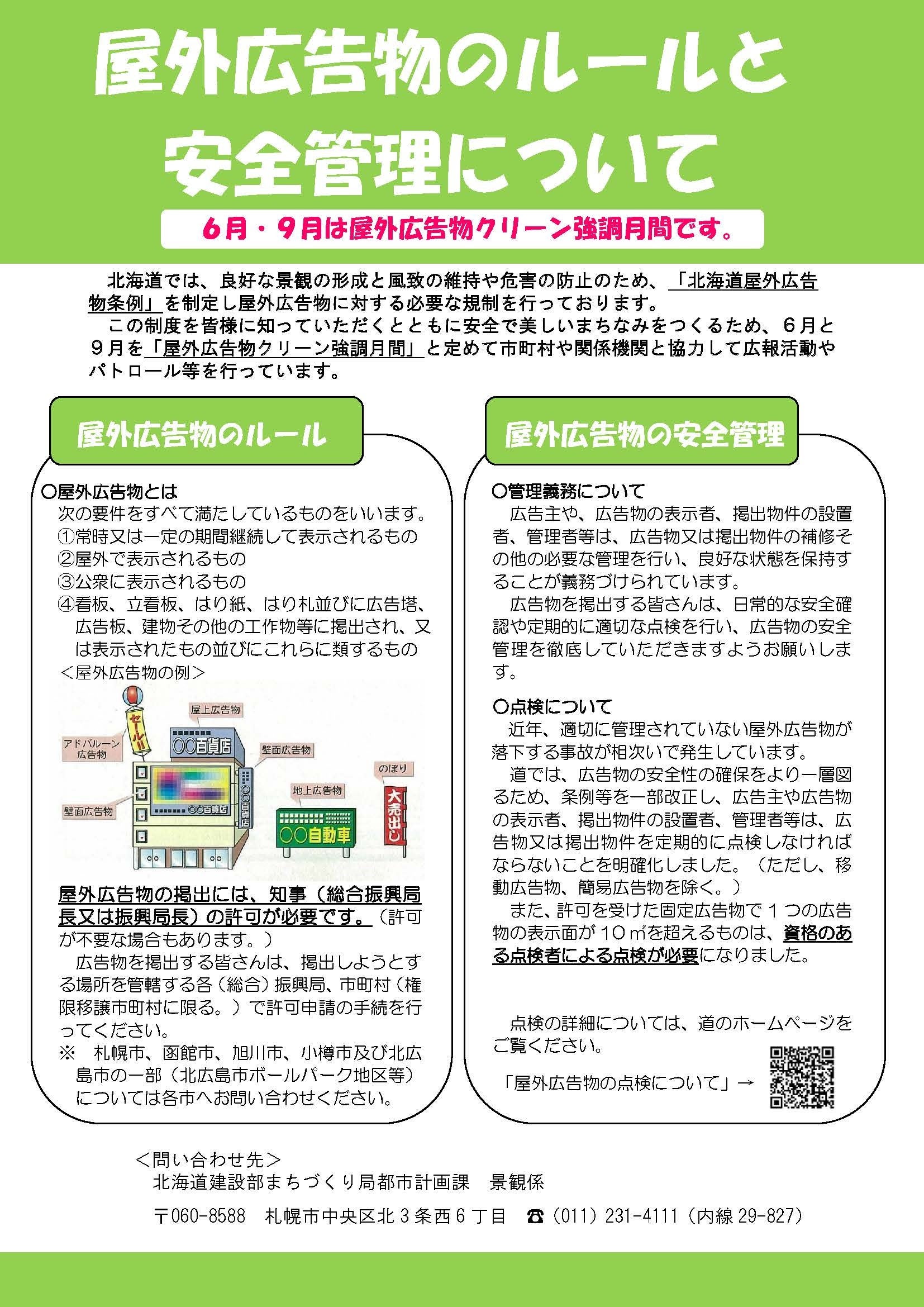 北海道では、良好な景観の形成と風致の維持や危害の防止のため、「北海道屋外広告物条例」を制定し屋外広告物に対する必要な規制を行っています。