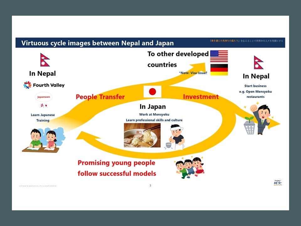 当社の経営理念は、「『食を通じた気持ちの温もり』を伝えることで世界中の人々を笑顔にする」ことです。目の前で提供する“お客様の食体験”はもちろんですが、“食”をきっかけとして当社のプログラムを履修した学生は、日本で働く機会を得ます。そして、日本での経験を活かして、ネパールに帰国し、日本食を通じたビジネスを展開するといった両国間の有益な循環が生まれると考えています。このためには、大前提として日本が彼らにとって働きたい魅力的な国であること、また、ネパールが彼らにとって帰りたいと思える魅力的な国であることが重要だと考えております。私たちが考える未来は、日本を含む世界各国の人々が、笑顔になる連鎖を創り上げていくことです。