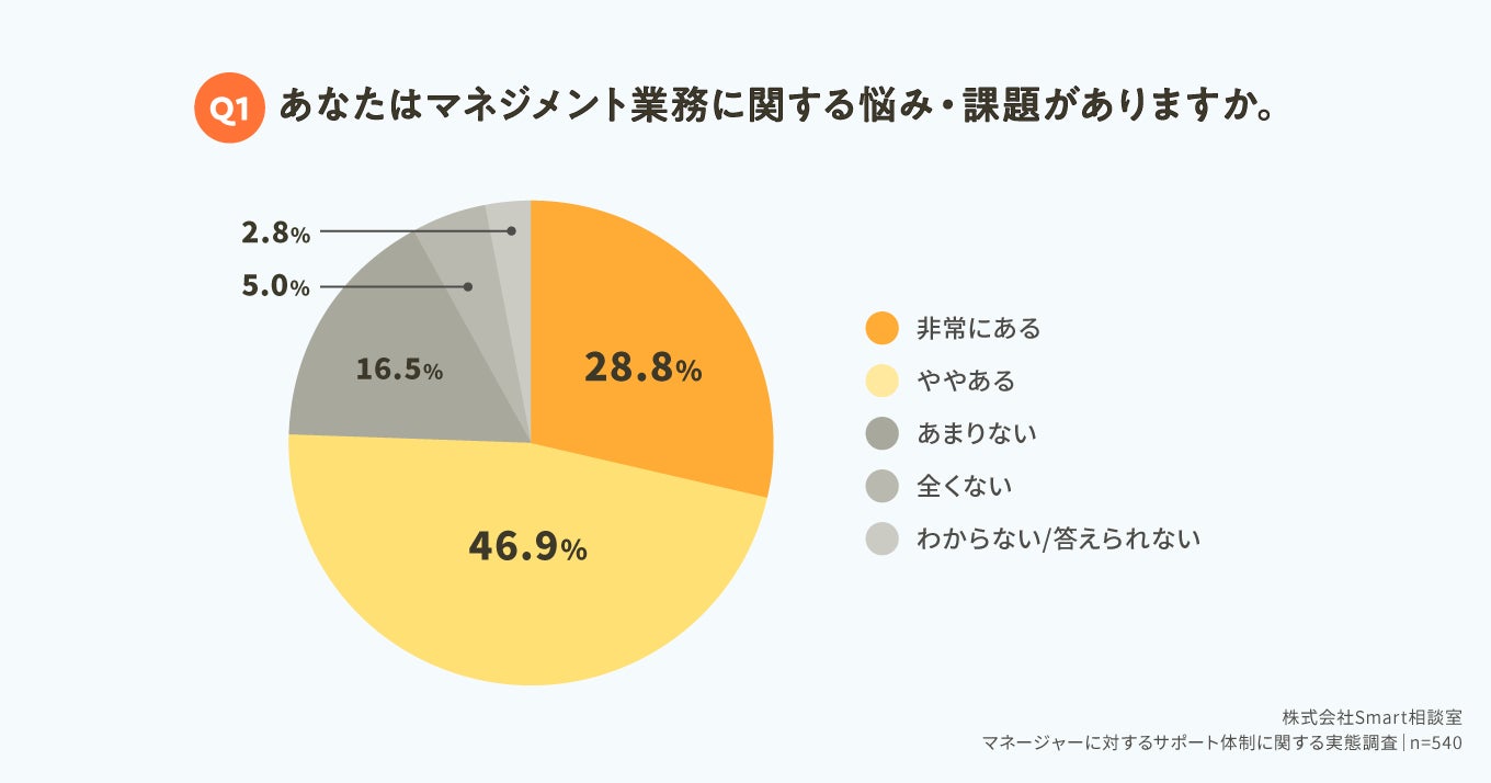 「Q1.あなたは、マネジメント業務に関する悩み・課題はありますか。」(n=540)と質問したところ、「非常にある」が28.8%、「ややある」が46.9%という回答となりました。