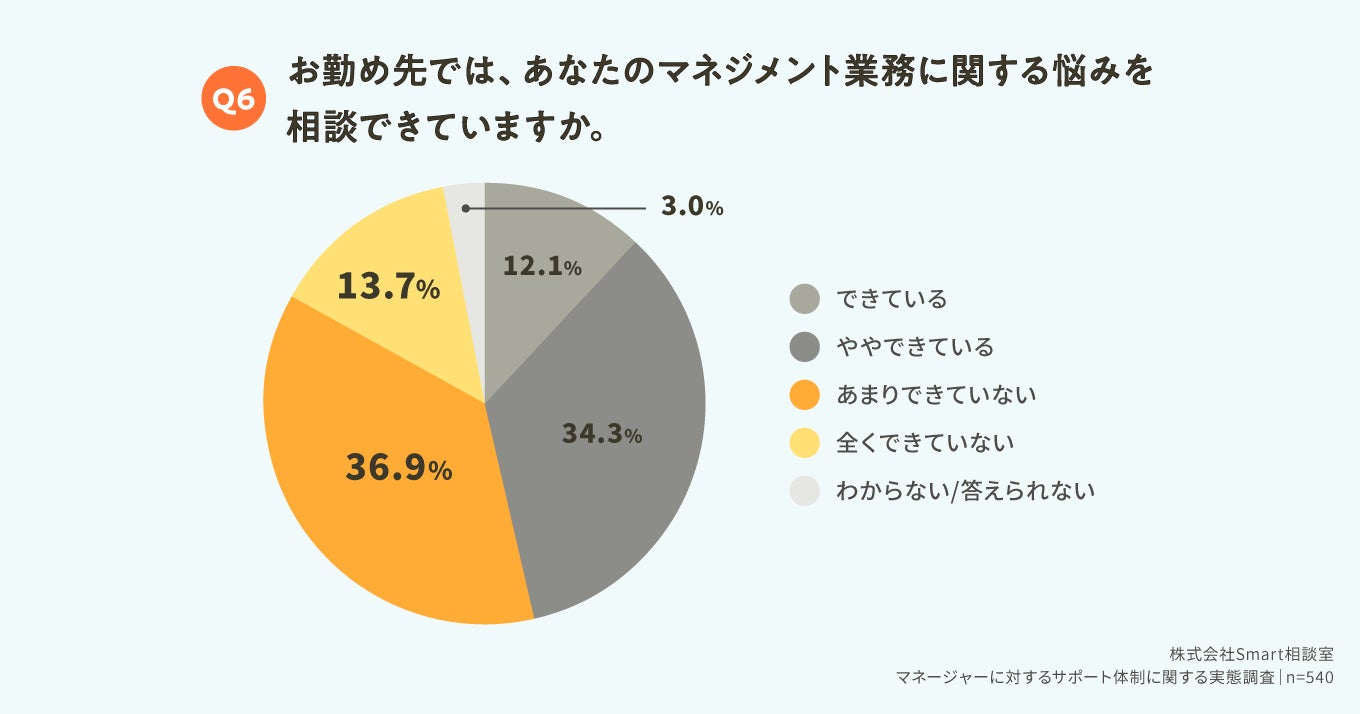 「Q6.お勤め先では、あなたのマネジメント業務に関する悩みを相談できていますか。」(n=540)と質問したところ、「全くできていない」が13.7%、「あまりできていない」が36.9%という回答となりました。