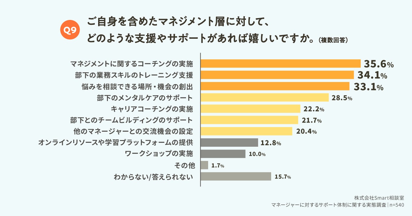 「Q9.ご自身を含めたマネジメント層に対して、どのような支援やサポートがあれば嬉しいですか。(複数回答)」(n=540)と質問したところ、「マネジメントに関するコーチングの実施」が35.6%、「部下の業務スキルのトレーニング支援」が34.1%、「悩みを相談できる場所・機会の創出」が33.1%という回答となりました。