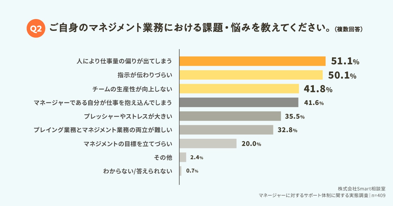 Q1で「非常にある」「ややある」と回答した方に、「Q2.ご自身のマネジメント業務における課題・悩みを教えてください。(複数回答)」(n=409)と質問したところ、「人により仕事量の偏りが出てしまう」が51.1%、「指示が伝わりづらい」が50.1%、「チームの生産性が向上しない」が41.8%という回答が集まりました。