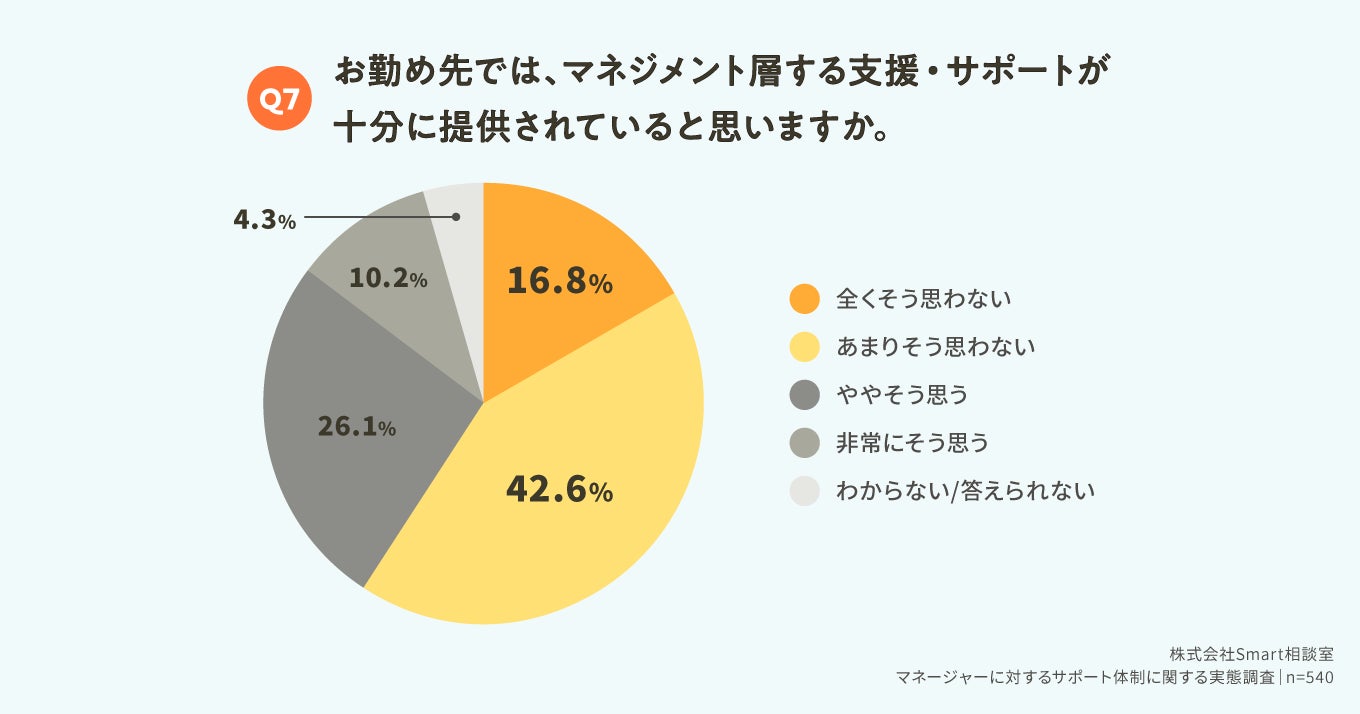 「Q7.お勤め先では、マネジメント層に対する支援・サポートが十分に提供されていると思いますか。」(n=540)と質問したところ、「全くそう思わない」が16.8%、「あまりそう思わない」が42.6%という回答となりました。