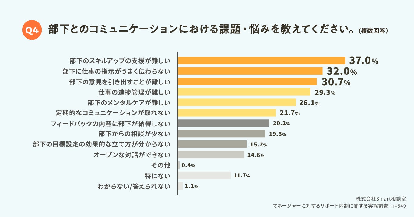 「Q4.部下とのコミュニケーションにおける課題・悩みを教えてください。(複数回答)」(n=540)と質問したところ、「部下のスキルアップの支援が難しい」が37.0%、「部下に仕事の指示がうまく伝わらない」が32.0%、「部下の意見を引き出すことが難しい」が30.7%という回答が寄せられました。