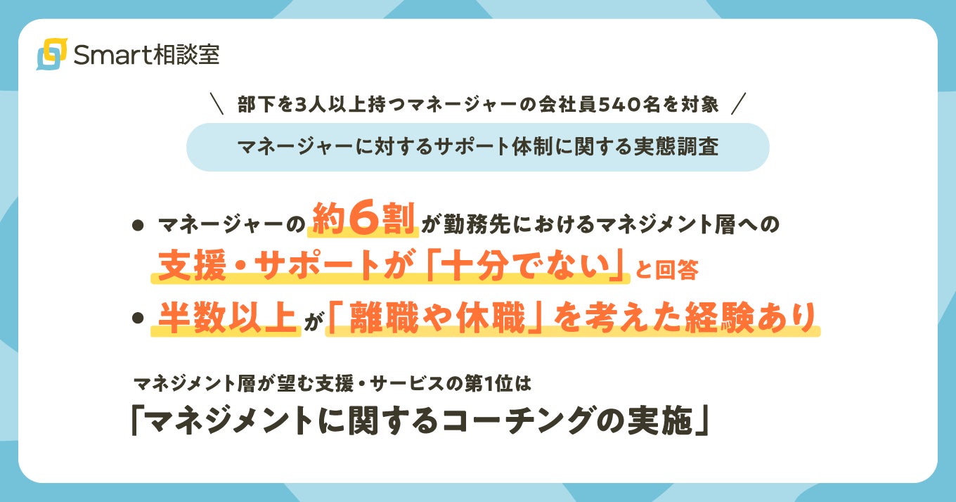 株式会社Smart相談室(本社:東京都港区、代表取締役・CEO:藤田 康男)は、部下を3人以上持つマネージャーの会社員540名を対象に、マネージャーに対するサポート体制に関する実態調査を実施しましたので、お知らせいたします。