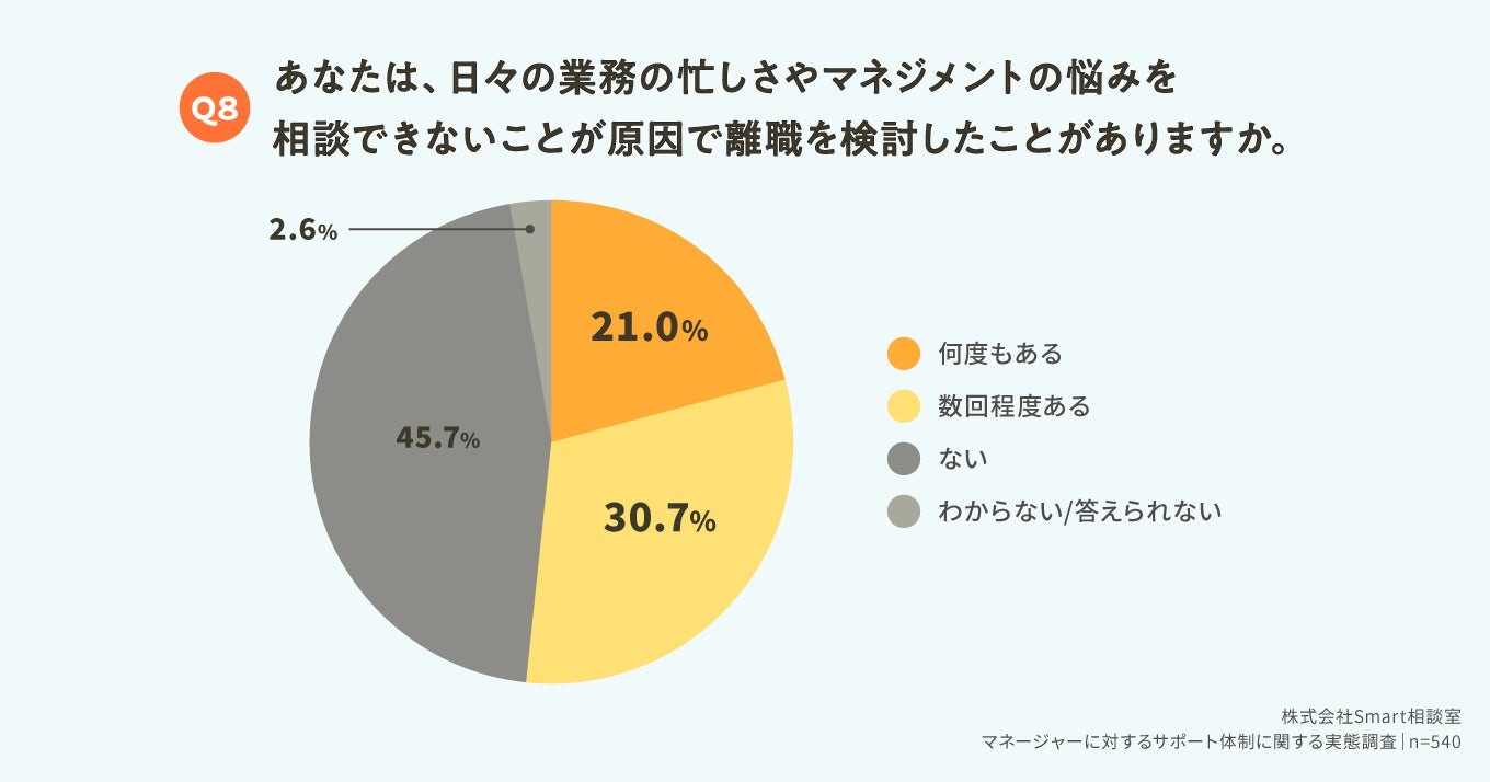 「Q8.あなたは、日々の業務の忙しさやマネジメントの悩みを相談できないことが原因で離職を検討したことがありますか。」(n=540)と質問したところ、「何度もある」が21.0%、「数回程度ある」が30.7%という回答となりました。