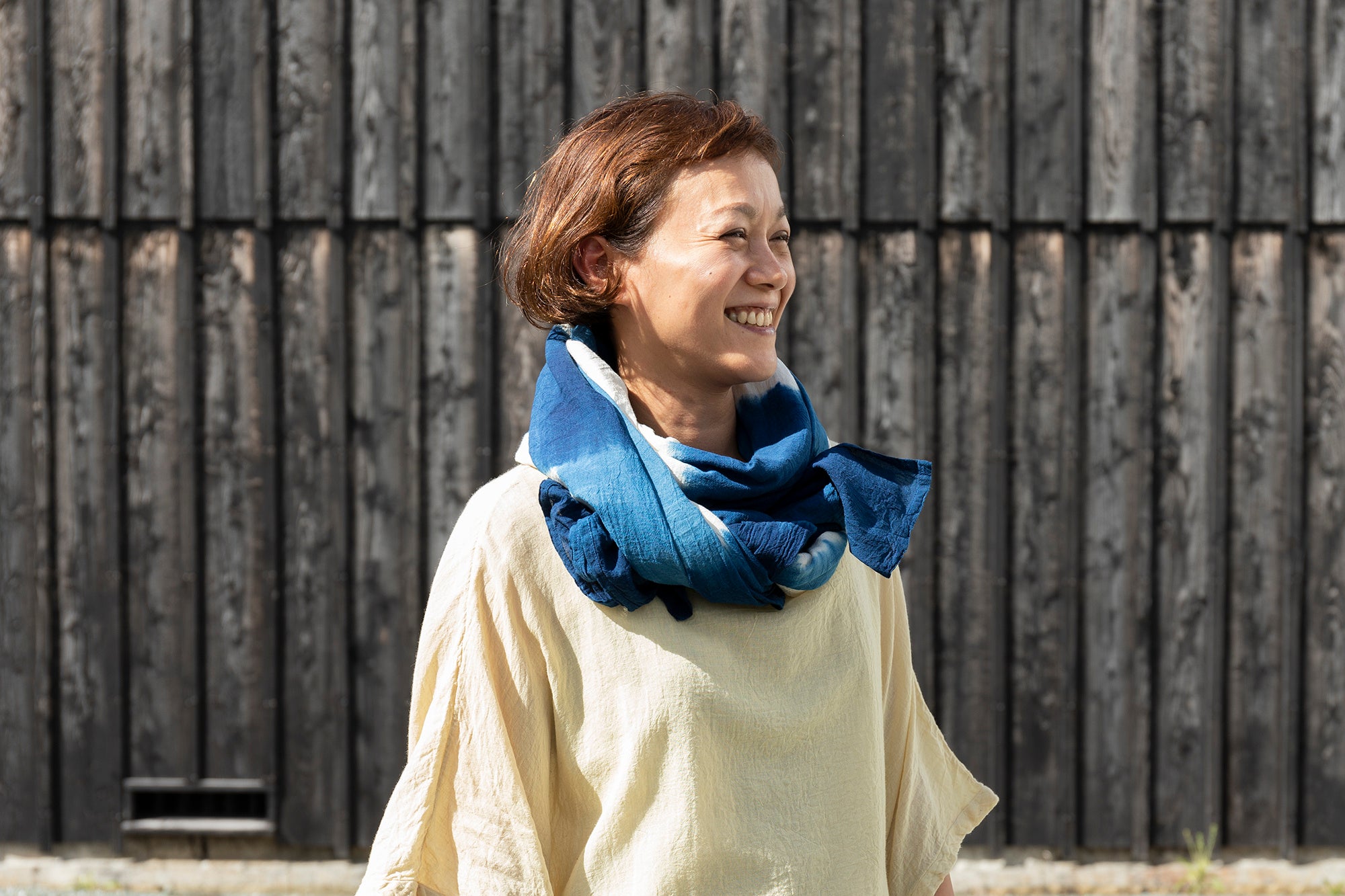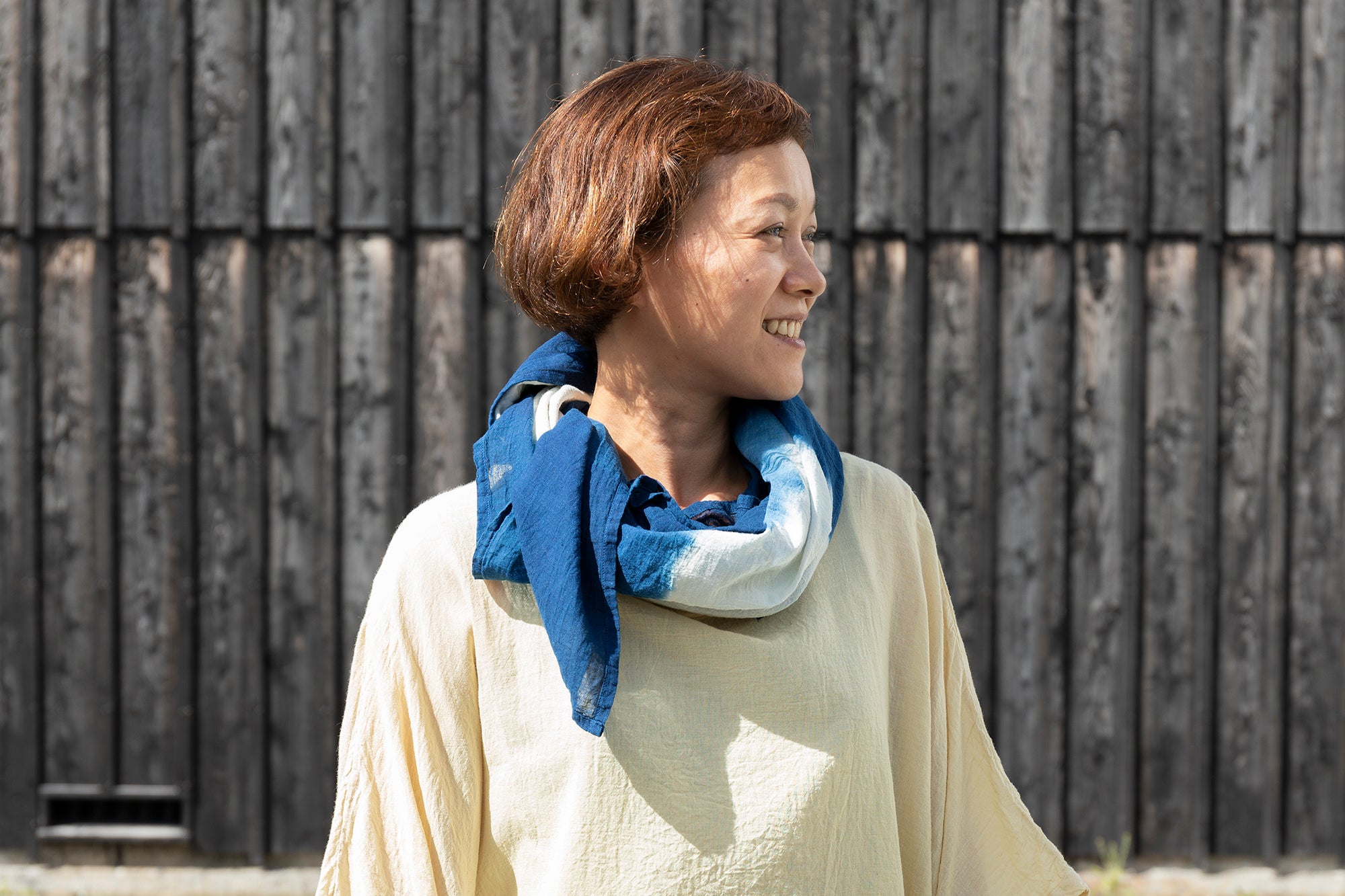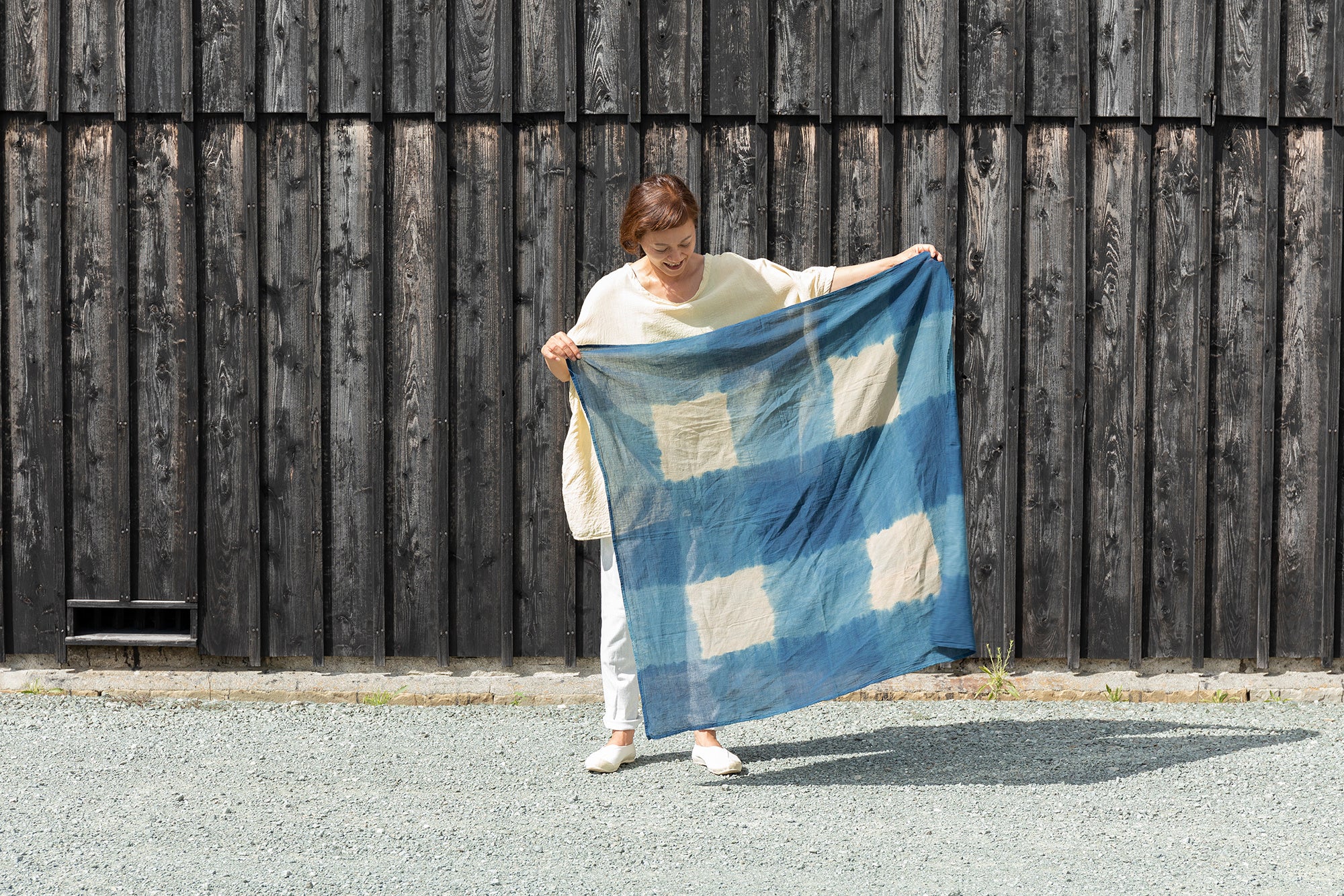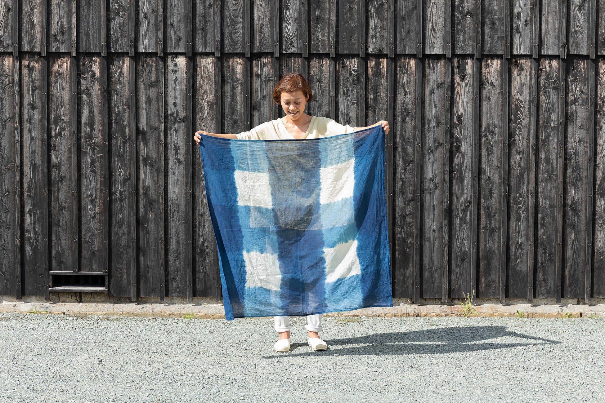 宝島染工は、2001年に大籠千春さんが福岡県大木町に構えた染色工房です。インド藍をはじめ、墨、ミロバランなど様々な天然染料を使い、絞り・折り・板締めなどの「防染」という伝統的な技法で染色加工を行っています。生産工程の具体化や数値化を進め、生産を管理し、1ヵ月で1000枚から2000枚を手染めで染める中量生産を可能にしています。また、自由な表現や染色の可能性の開発や提案としてオリジナルの商品も展開し、企画デザインから自分たちで手掛けています。