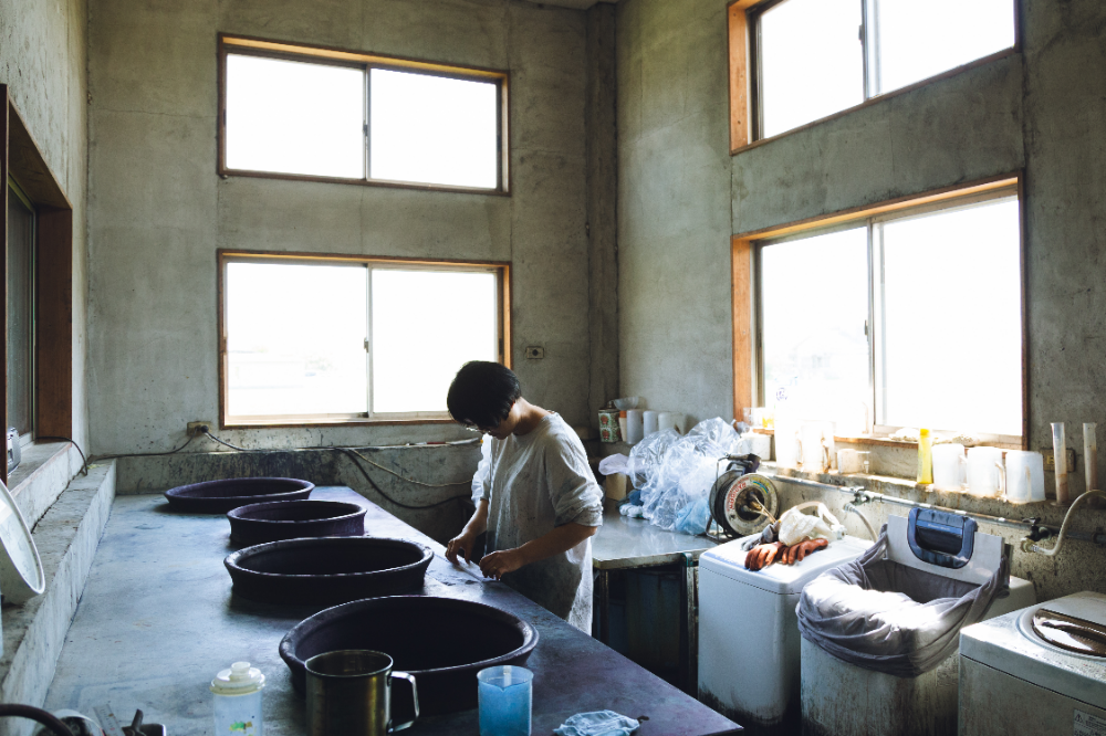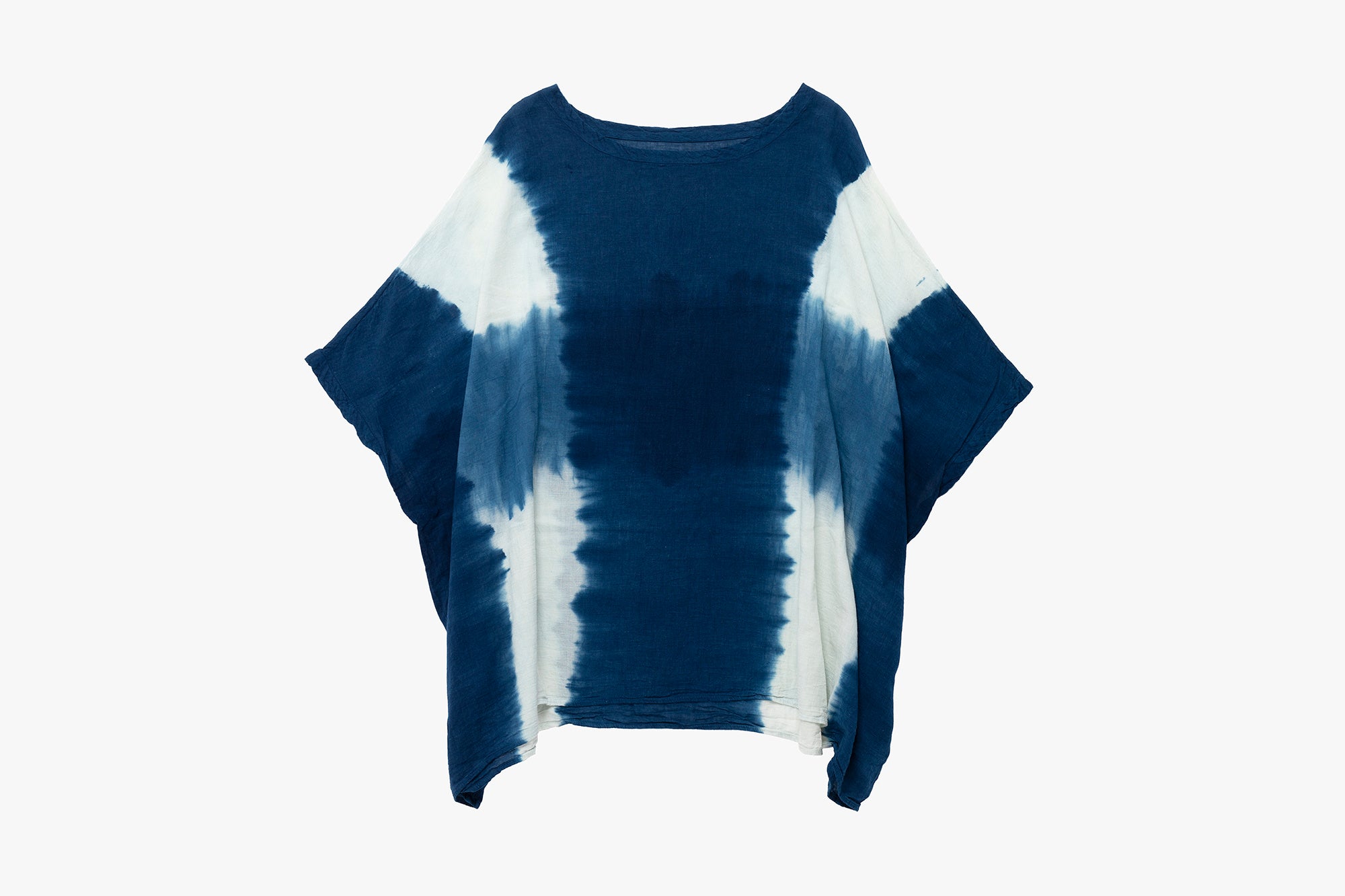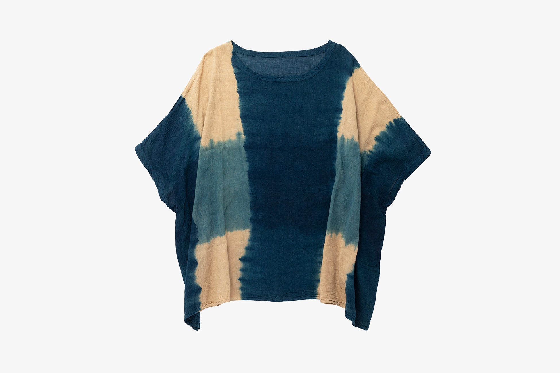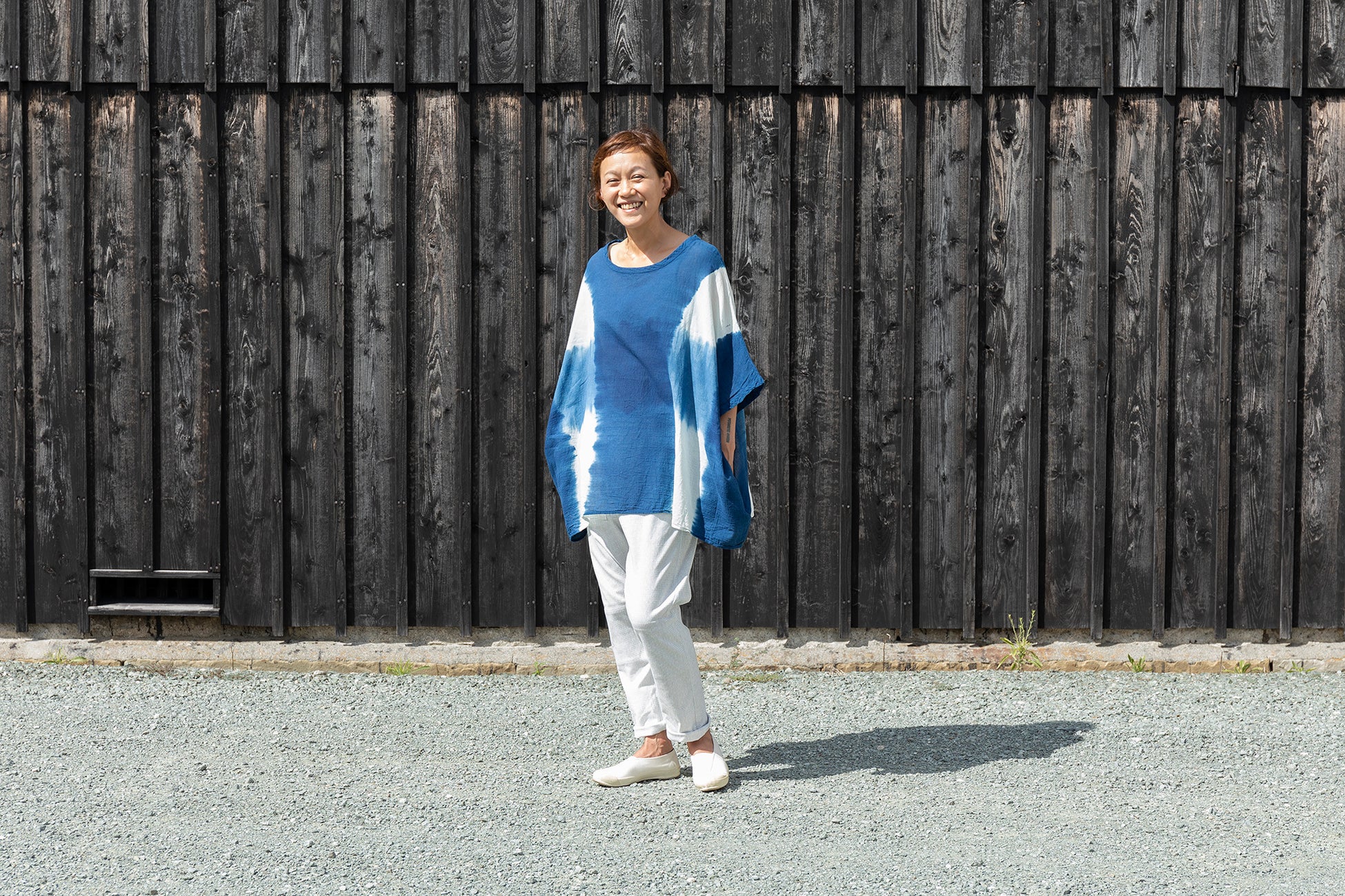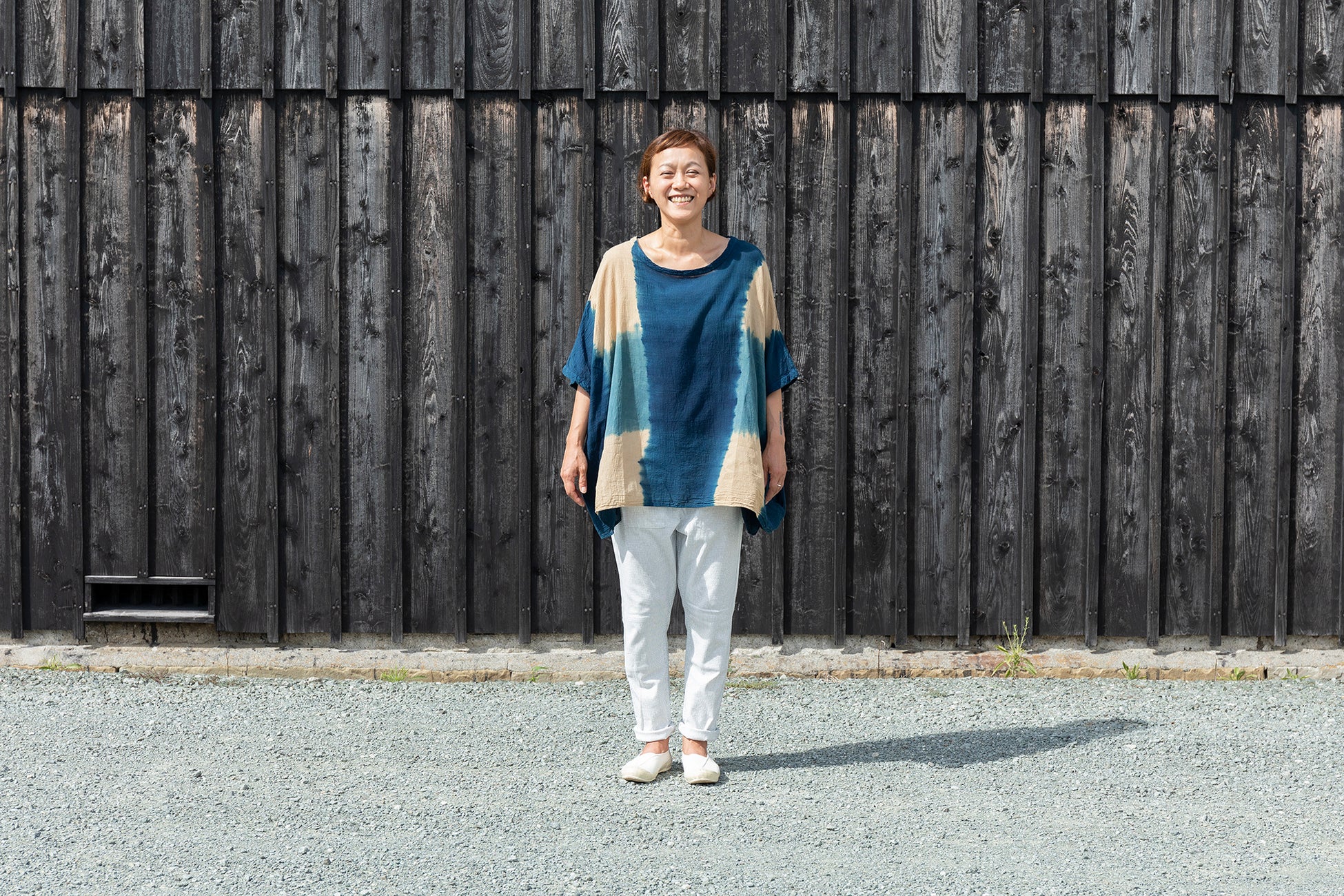 宝島染工は、2001年に大籠千春さんが福岡県大木町に構えた染色工房です。インド藍をはじめ、墨、ミロバランなど様々な天然染料を使い、絞り・折り・板締めなどの「防染」という伝統的な技法で染色加工を行っています。生産工程の具体化や数値化を進め、生産を管理し、1ヵ月で1000枚から2000枚を手染めで染める中量生産を可能にしています。また、自由な表現や染色の可能性の開発や提案としてオリジナルの商品も展開し、企画デザインから自分たちで手掛けています。