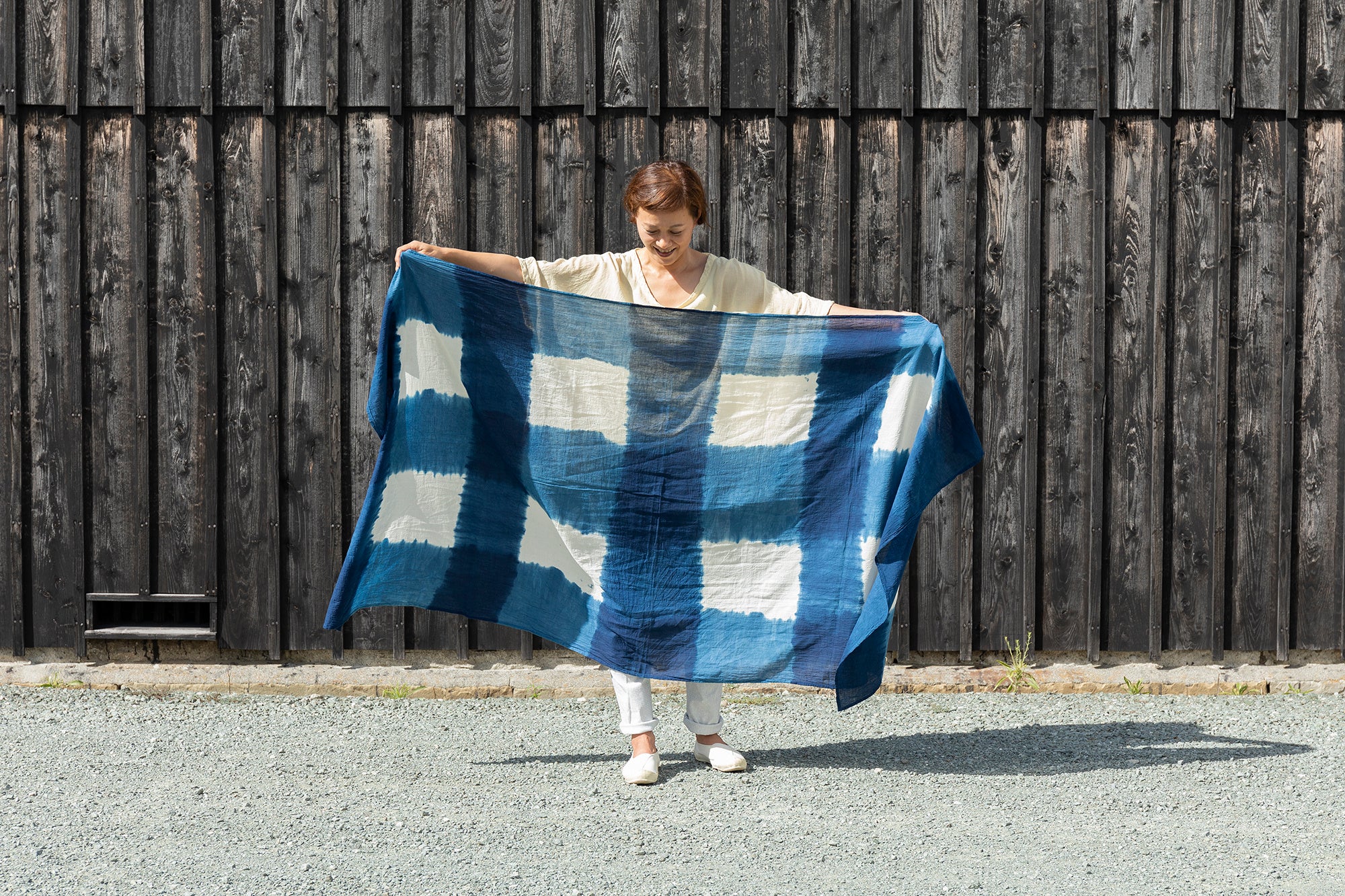 宝島染工の今回の新作は、BIG CHECKという名の通り、大きな格子柄を絞り染めで表現しています。色はブラウンとホワイトの2色です。ブラウンは、インド藍で絞り染めした後に草木染めを重ねています。ホワイトは、インド藍の絞り染めです。どちらも天然染料ならではの色合いと経年変化をお楽しみいただけます。