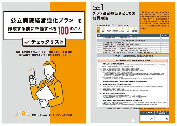 メディカル・データ・ビジョン株式会社(東京都千代田区、代表取締役社長:岩崎博之)は、公立病院の経営強化プラン策定を支援するために、同プランを作成するために準備すべきことをまとめたチェックリストを作成し、無料でお配りすることになりましたので、お知らせします。ご希望の病院担当者さまは、以下のURLから専用サイトに入り、お申込みください。