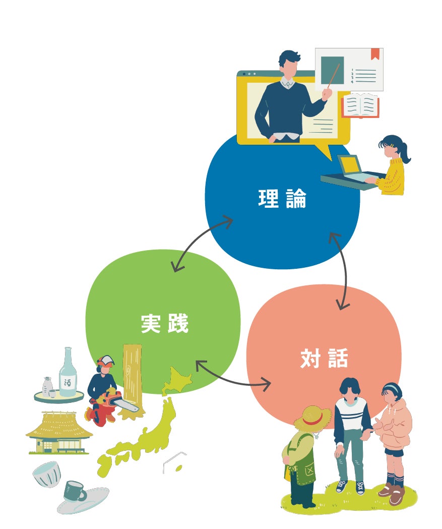 専門的な知を体系的に学ぶ「理論」と、そして多様な他者との関係性の中で問いを深める「対話」と、社会の現場における「実践」の3つを往還することで、学生一人ひとりが問いを立て、他者と共に解決に向かう力、つまり、共創する力を養成します。