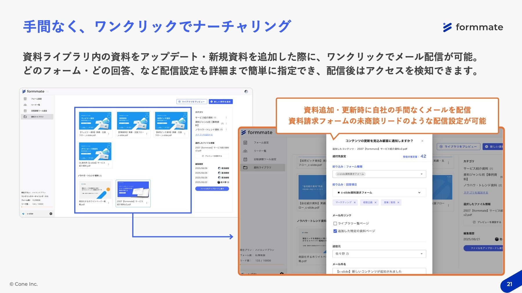 資料ライブラリに資料を追加するだけで、過去の見込み顧客へワンクリックでメール配信が可能です。