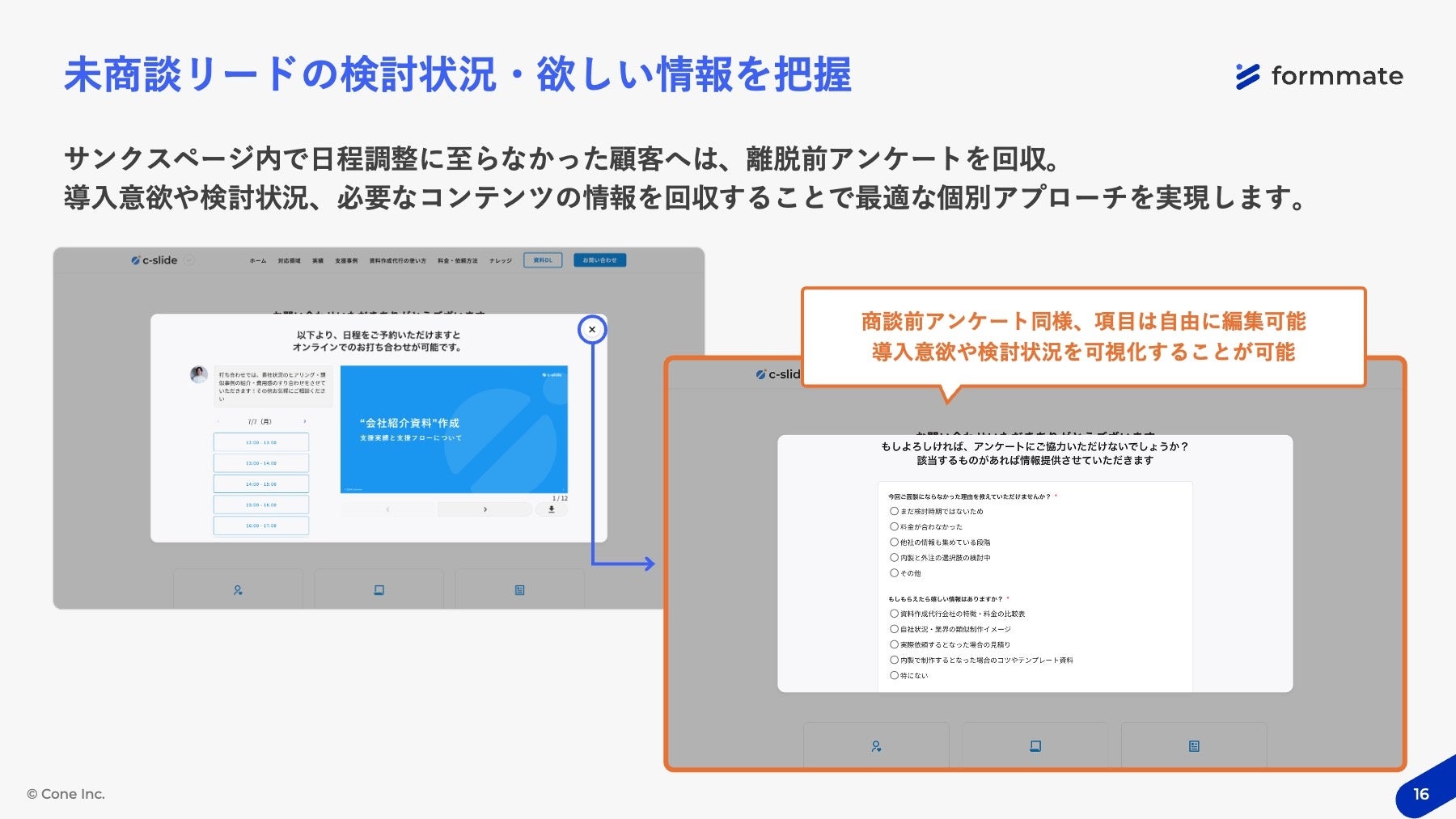 資料請求リードなど、資料閲覧後商談につながりづらい見込み顧客には離脱前にアンケートを回収可能です。