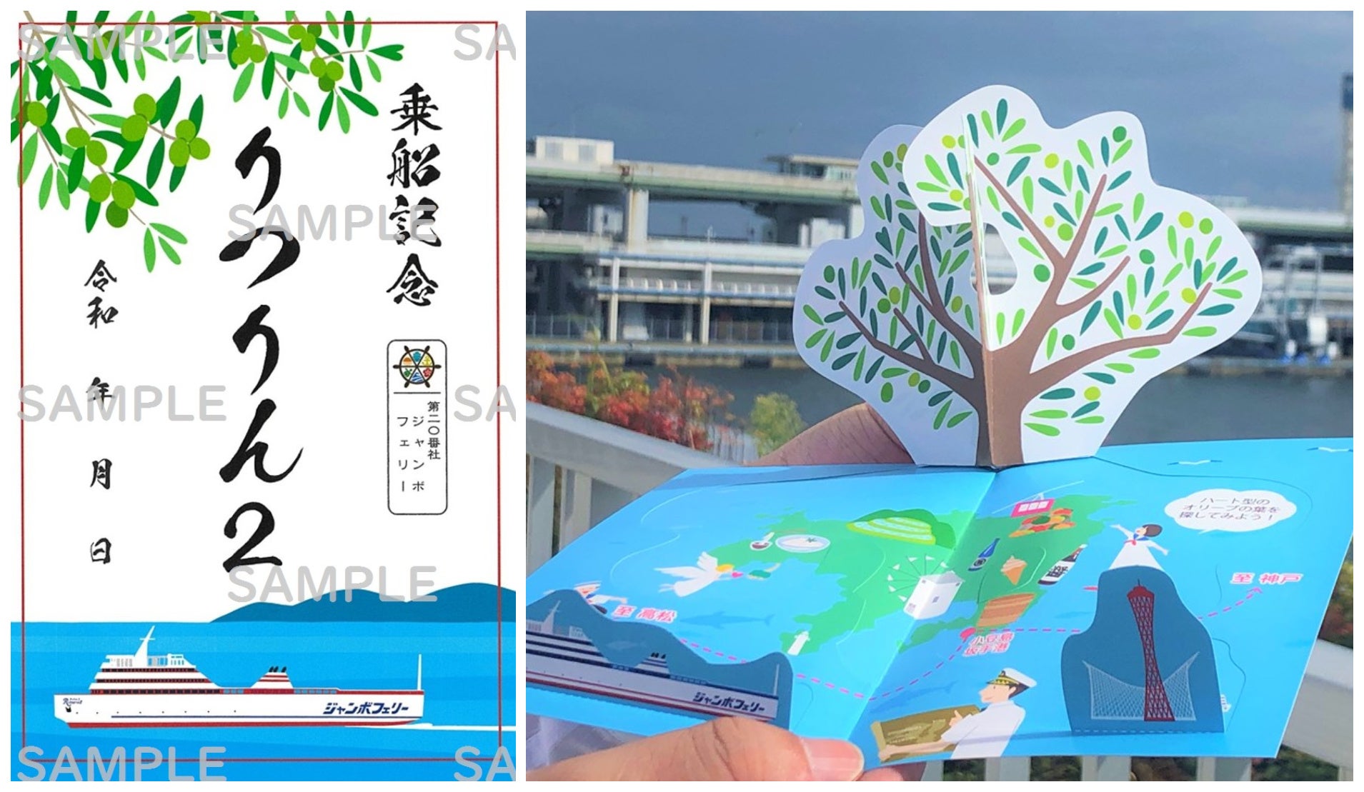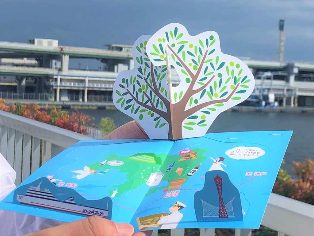 中を開くと、大きなオリーブの木やフェリーのイラストが飛び出すインパクト抜群の御船印。デザインは神戸市のイラストレーター有村綾さんが担当しています。