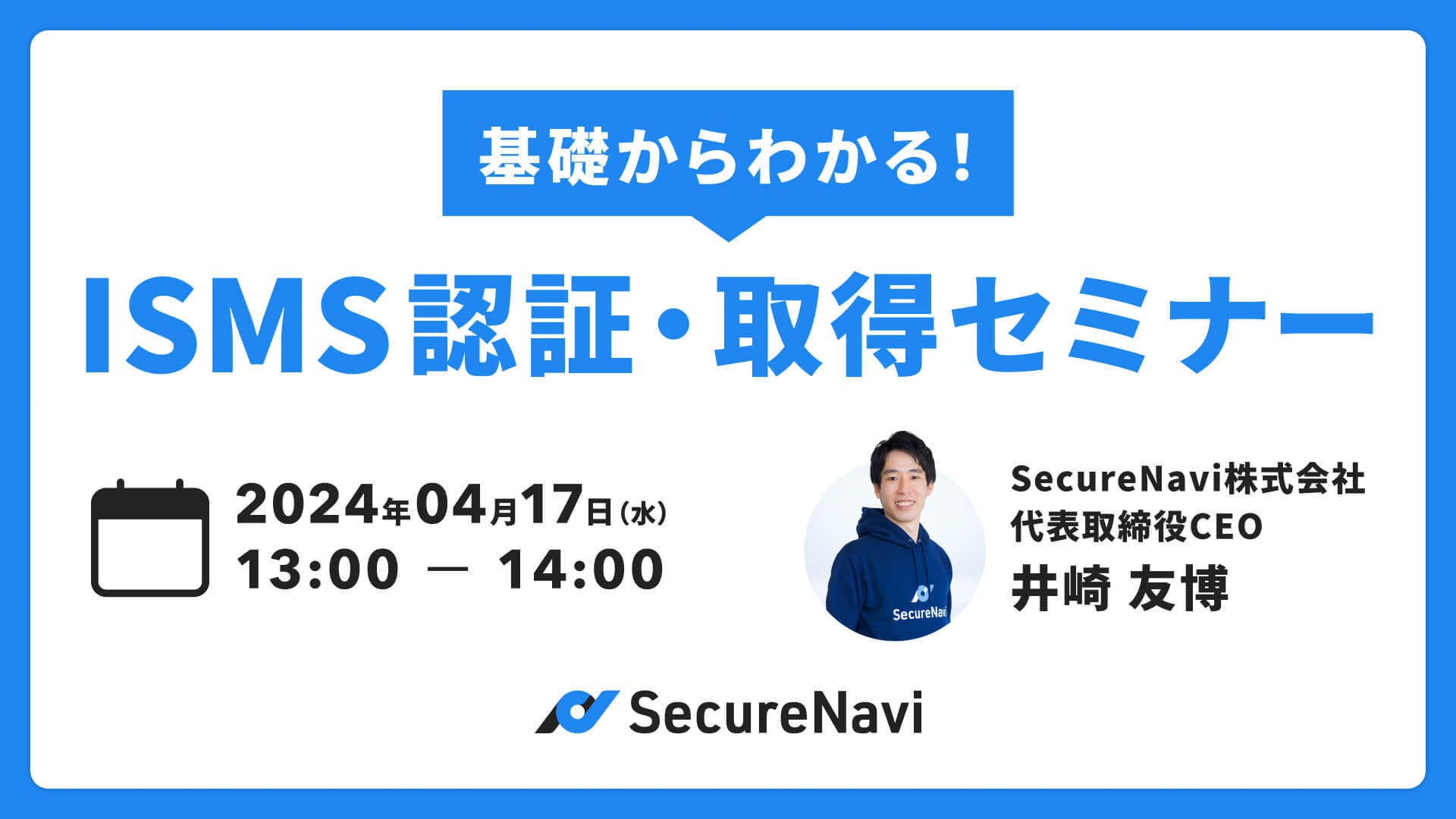 ISMS・Pマークオートメーションツール「SecureNavi」を提供するSecureNavi株式会社(本社:東京都中央区、代表取締役CEO:井崎友博 以下、当社)は、2024年4月17日(水)13:00-14:00に「基礎からわかる!ISMS認証・取得セミナー」を開催します。