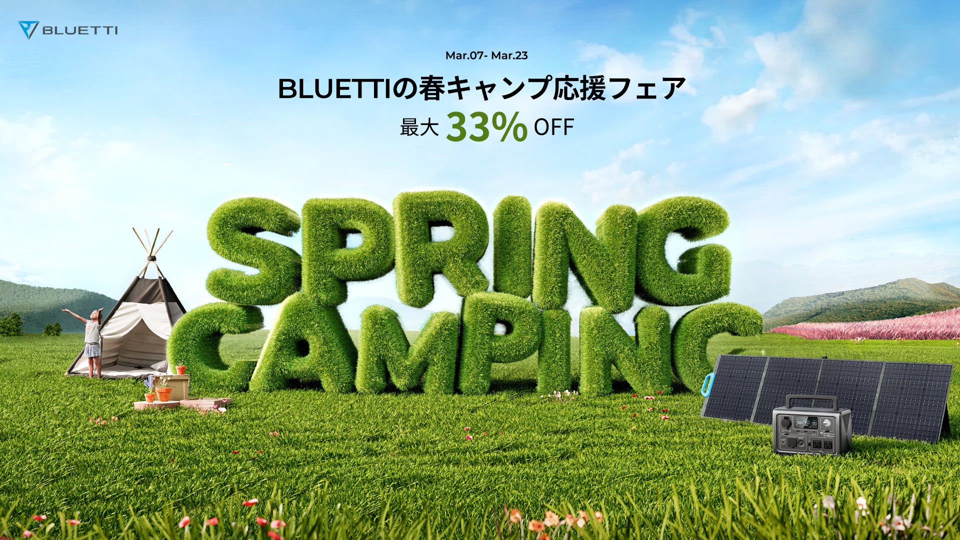 BLUETTI JAPAN株式会社(ブルーティ)は、を2023年3月7日(火)から3月23日(木)まで実施します。ソロキャンプから大勢でのキャンプまで、シーンに選んでいただける豊富なラインナップと、ご購入金額に応じたプレゼントで春キャンプを楽しみたい皆さまを応援いたします。