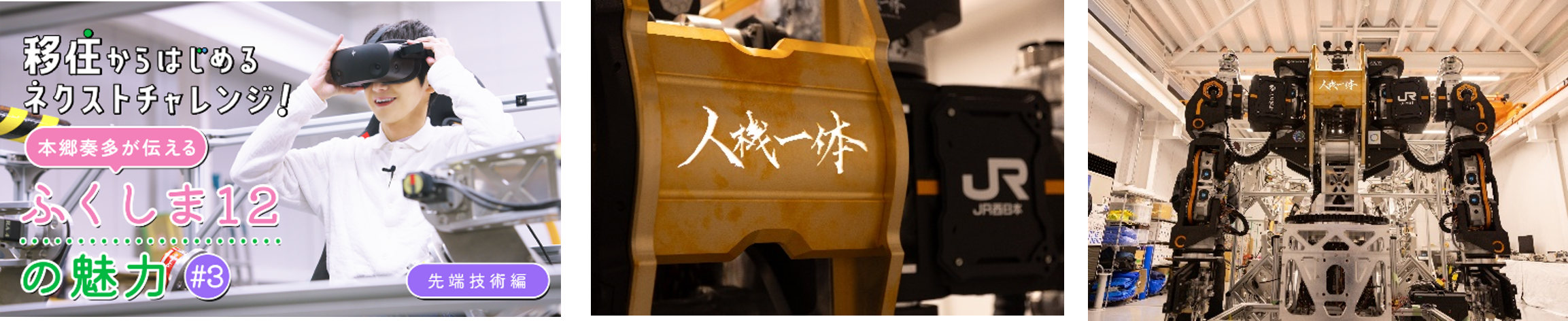 第3回、最後の旅のテーマは「先端技術」。実は最先端技術の研究が盛んな福島12市町村。様々な分野の企業会社の方々が日々、研究に取り組まれています。今回はその中でロボット工学技術に基づいた人型重機の研究・開発をする「人機一体」さんに本郷さんが訪問。そこで移住して働く花岡さんと飯田さんに福島12市町村で研究をするメリットなどについてお伺いします。制作されているロボットのコックピットに座るなど、実際に本郷さんが体験をされました。