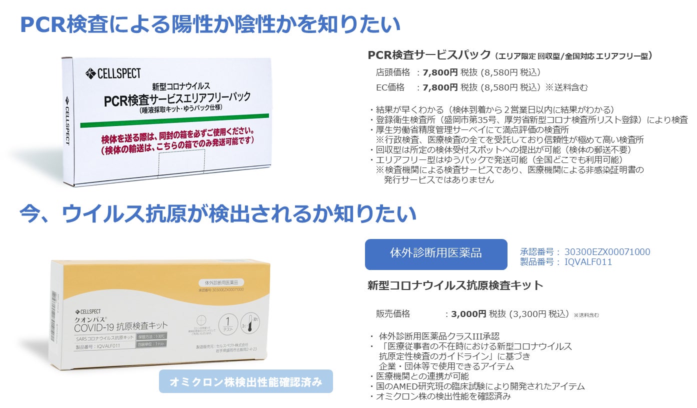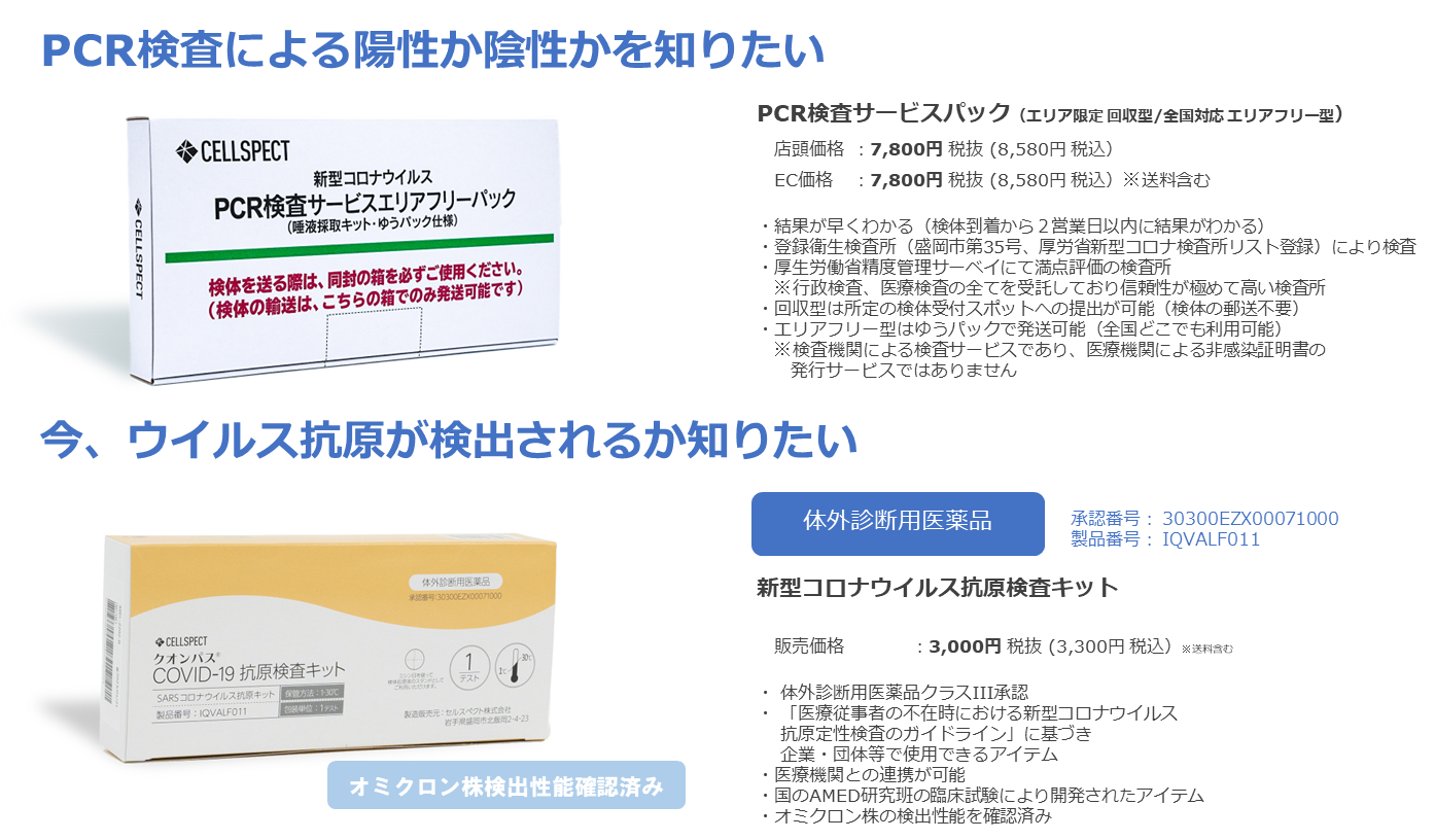 セルスペクト株式会社製の検査キットは、体外診断用医薬品抗原検査キット等を中心に50万個販売し、企業や自治体、医療機関、介護施設、学校からなど、様々な方から受注とご利用を頂いております。
