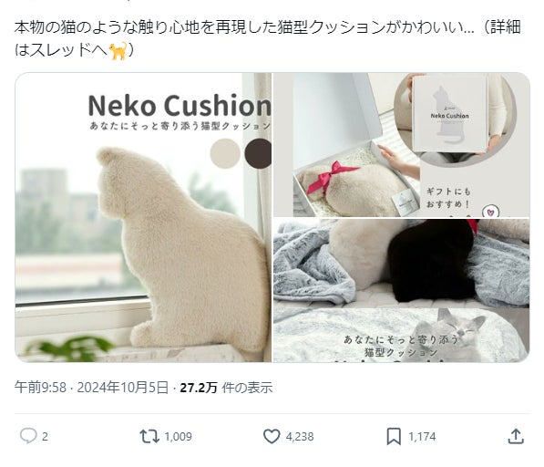 株式会社新陽トレーディング(東京都中央区)が企画した、まさに猫のような肌触りを再現した『リアル猫まくら(Neko Cushion)』が「X」で紹介されました。