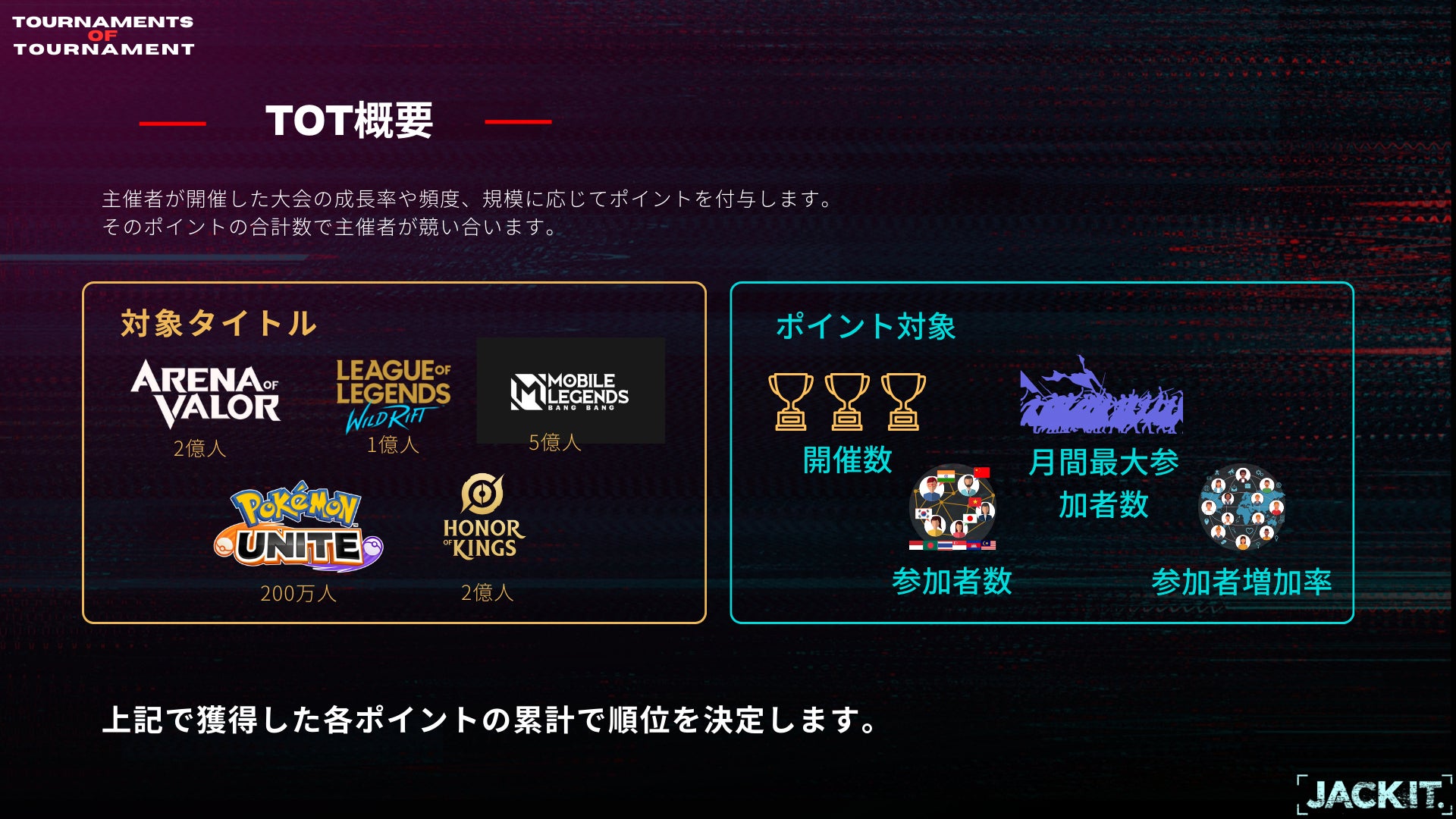 「JACK IT.」は今後も「TOT」を通し、モバイルMOBA、eスポーツを愛する人々が豊かに生きられる世界の実現を目標に言語、国境の壁を超えて、コミュニティリーダーを支援し、彼らの活動とeスポーツ全体の拡大に向けて取り組んでいきます。