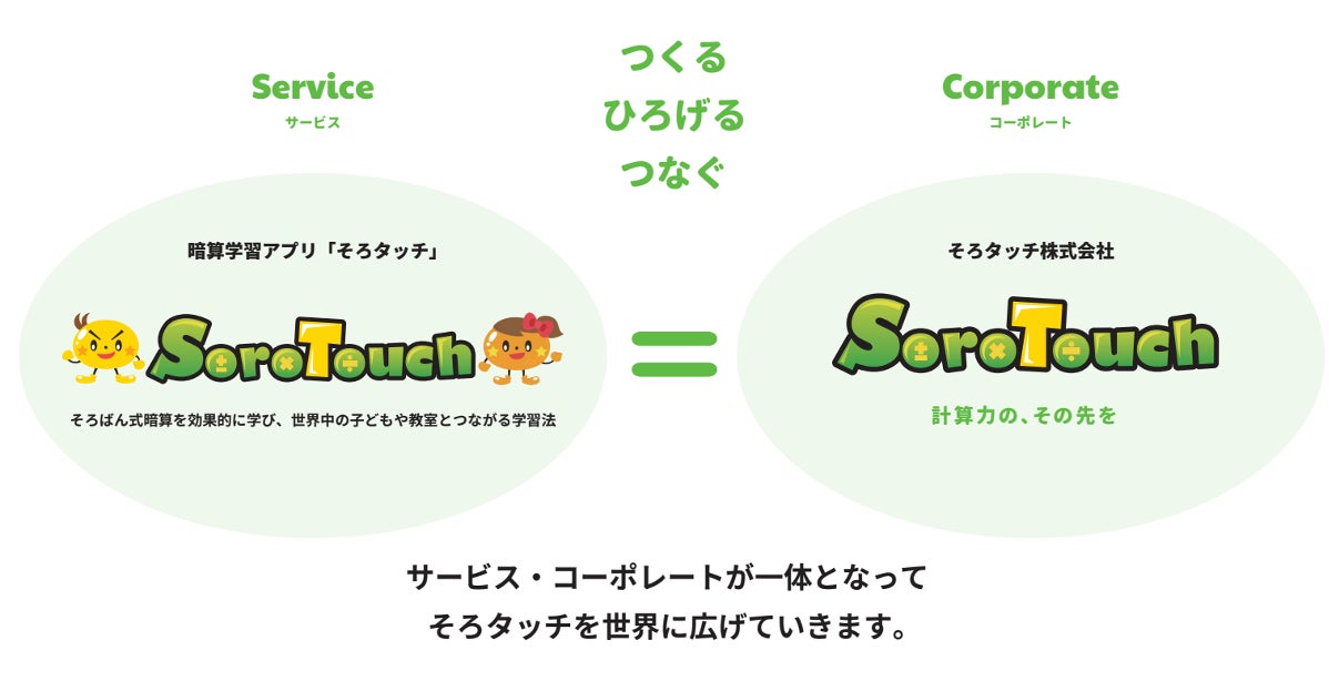 「そろタッチ」は、2016年10月7日にアプリを公開して以来、そろばん式暗算を特許技術の暗算モードで学ぶ唯一の学習ツールとして、現在では世界19カ国、約300教室、1万人の学習者に広がっています。子どもたちの可能性は無限であり、その成長を支えるため、さらなる飛躍に向けて、社名とタグライン、企業理念、そして「そろタッチDNA」を刷新いたしました。これからも、皆様により一層愛される「そろタッチ」を目指し、進化を加速させてまいります。