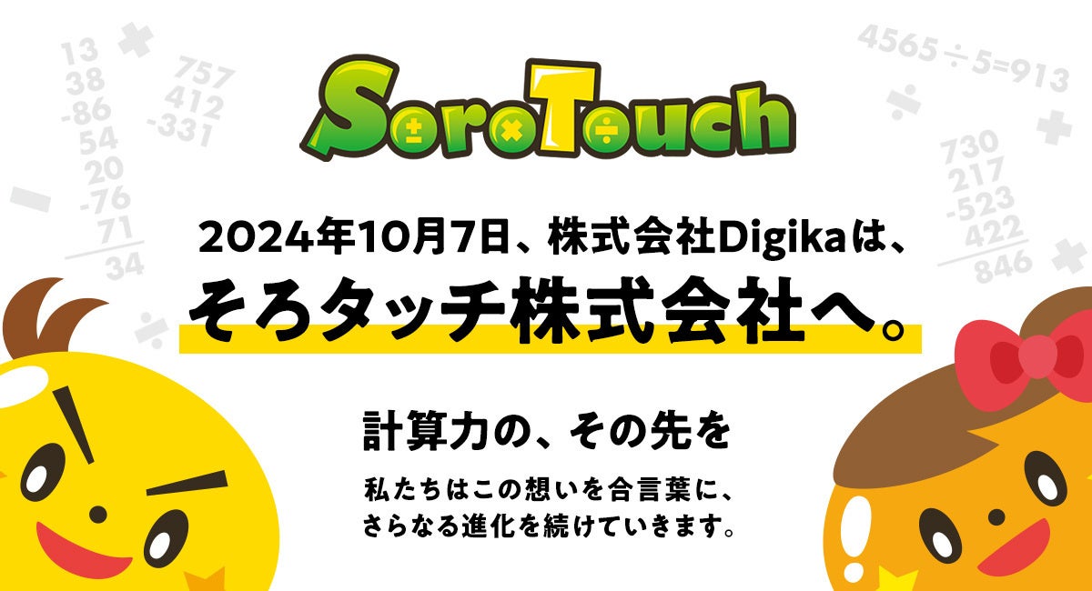 株式会社Digikaは2024年10月7日(月)、社名を「そろタッチ株式会社」(本社:東京都千代田区、代表取締役社長:橋本恭伸)に変更し、「計算力の、その先を」タグラインに掲げ、新たなワクワクを進化しながら「つくり」、身につけた計算力を「ひろげ」、世界中を感動で「つないで」まいります。