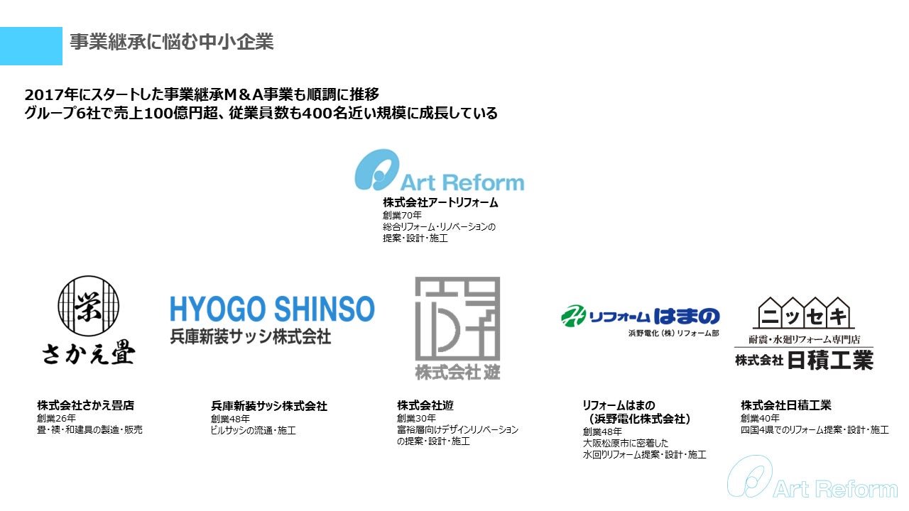 アートリフォームは2017年より事業継承M&A事業を開始しました。現在、後継者不足で事業継承に悩む多くの中小企業が存在することが社会問題にもなっています。リフォーム業界においても90年前後に多くの企業が創業、30年~40年経ち、事業継承を検討し始める企業も増えてきました。アートリフォームとしては「事業の幅を広げる」「新エリアの開拓」を目的に事業継承M&Aに取り組んでいます。これに加えて「地域に根ざした誠実な優良企業であること」「アートリフォームのミッション・ビジョンに共感頂けること」の2つを満たす企業がM&Aの決断ポイントとしております。現在5社がグループインし、アートリフォームグループとしての事業強化を進めています。